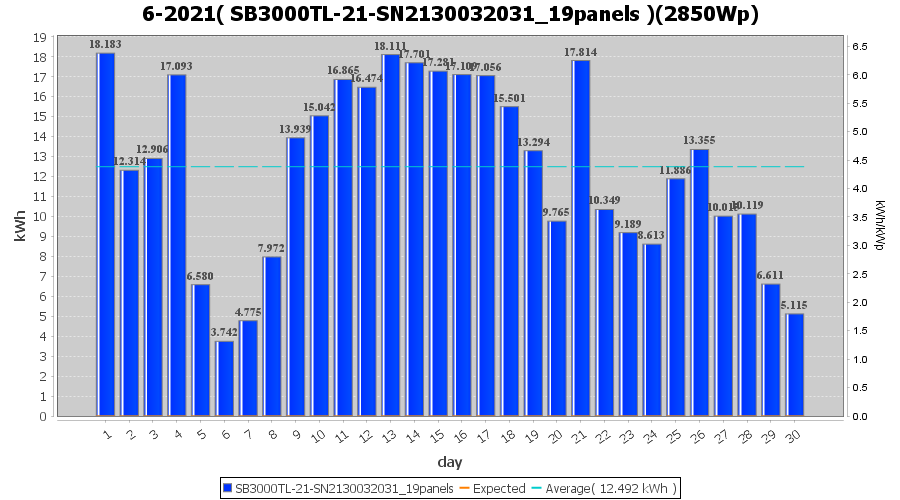 | 18-6-2021 | kWh | Sum | W/Wp | 32.032 | 6000 | 5.3 | 14.815 | € 11.52 | 4.2 |
