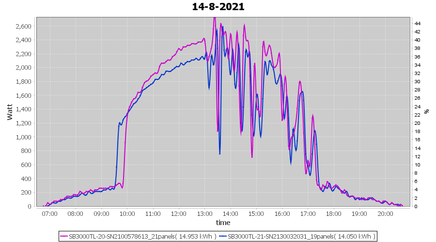 | 14-8-2021 | kWh | Sum | W/Wp | 29.003 | 6000 | 4.8 | 13.414 | € 10.43 | 4.3 |