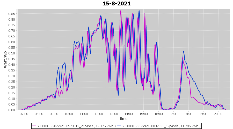 | 15-8-2021 | kWh | Sum | W/Wp | 23.971 | 6000 | 4.0 | 11.087 | € 8.62 | 3.6 |
