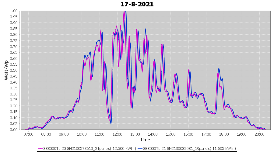 | 17-8-2021 | kWh | Sum | W/Wp | 24.105 | 6000 | 4.0 | 11.149 | € 8.67 | 3.6 |