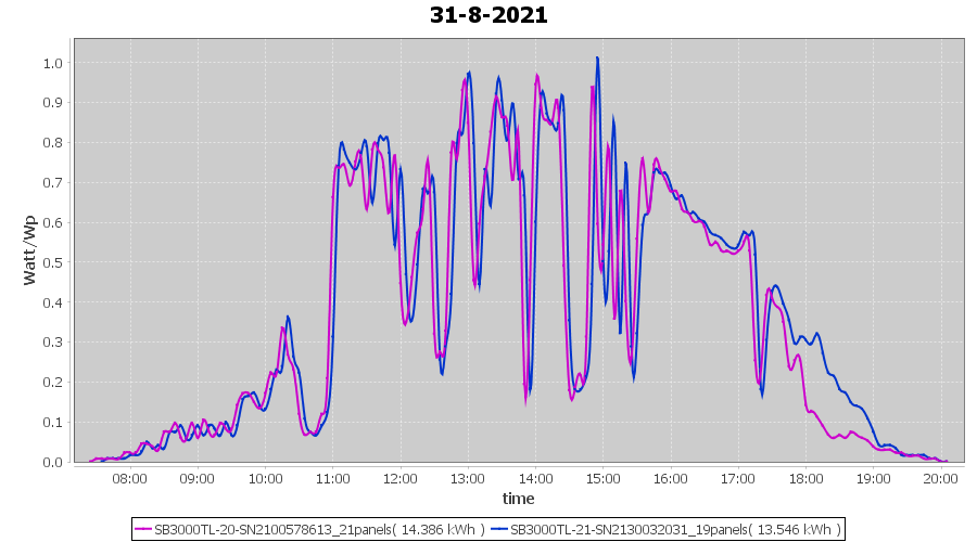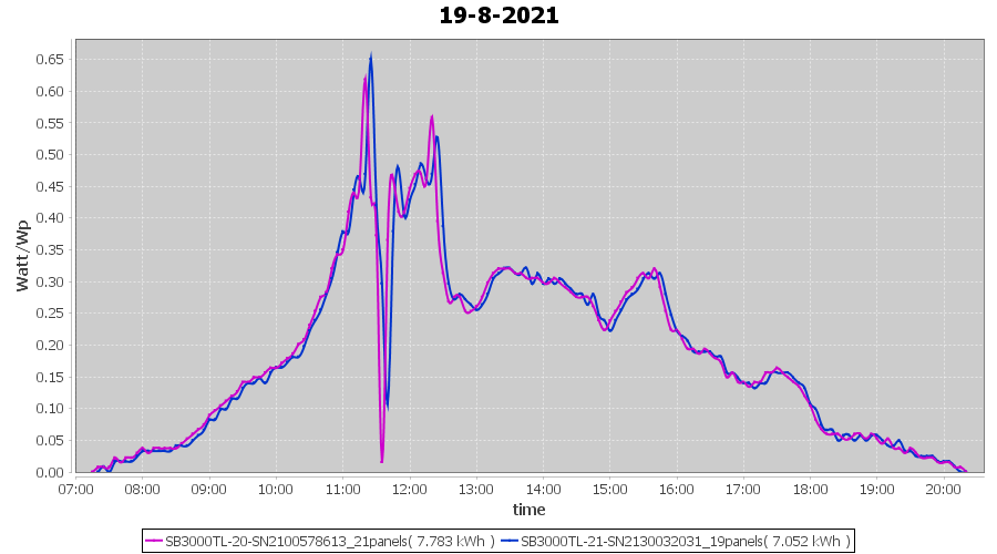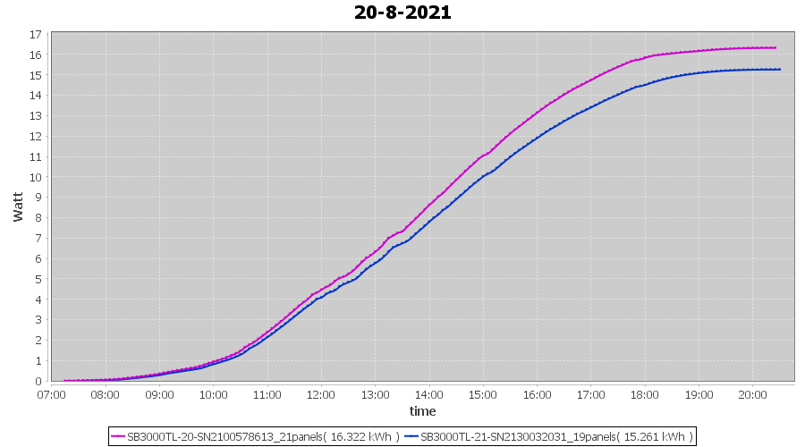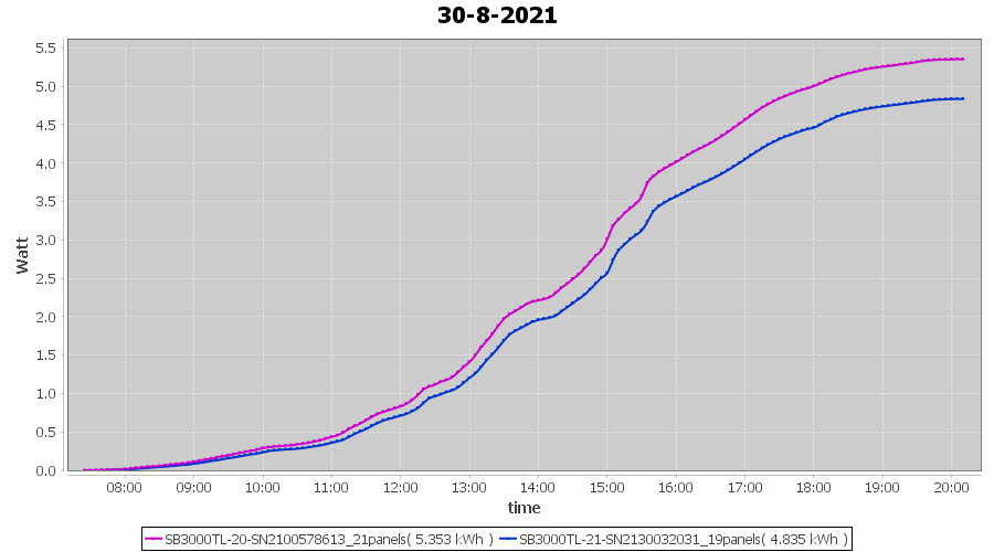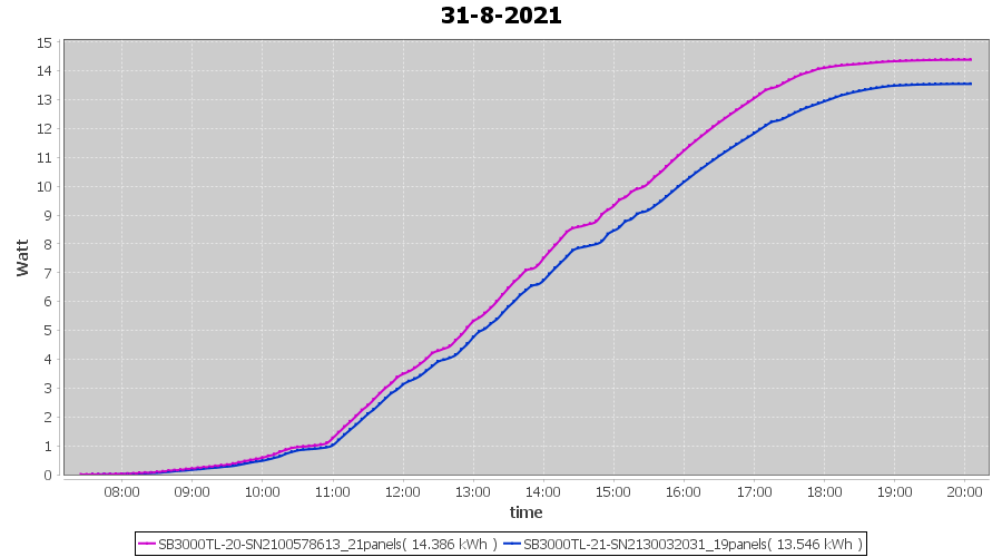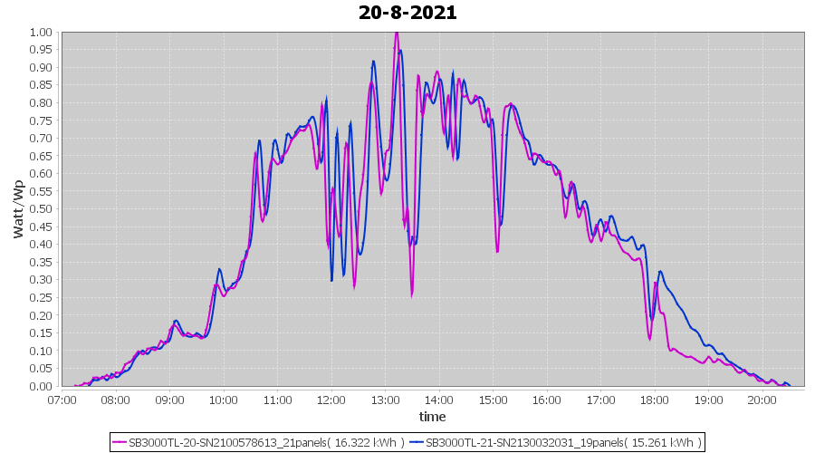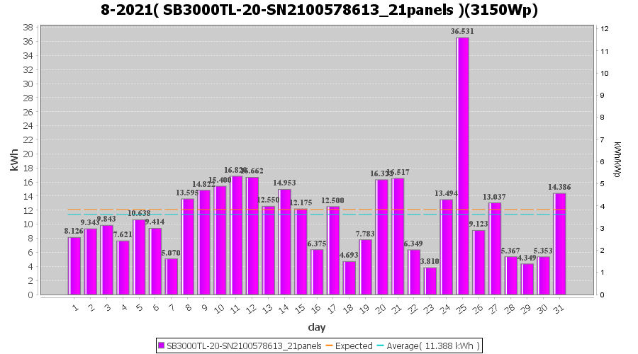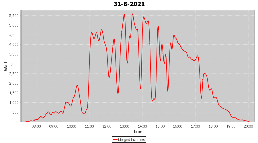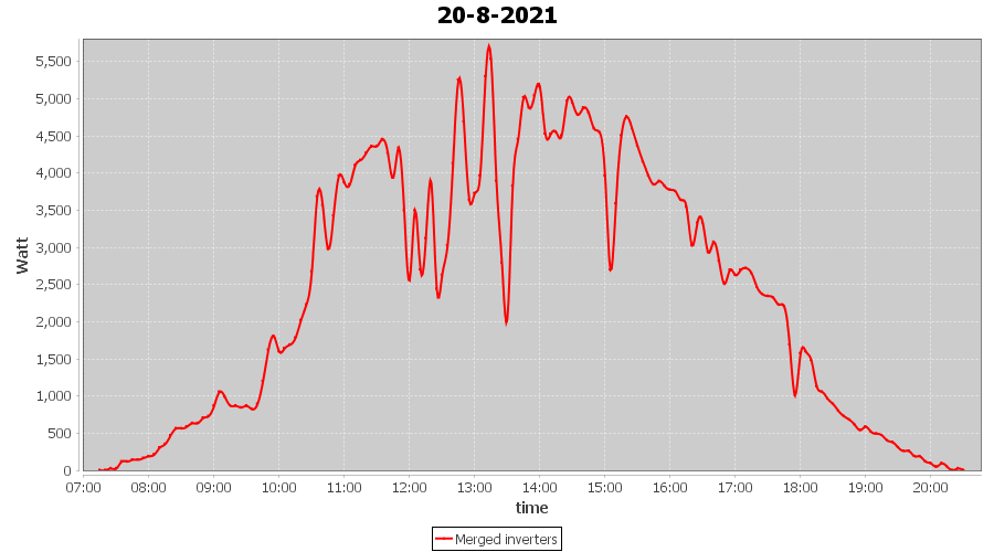 | 20-8-2021 | kWh | Sum | W/Wp | 31.583 | 6000 | 5.3 | 14.607 | € 11.35 | 4.7 |