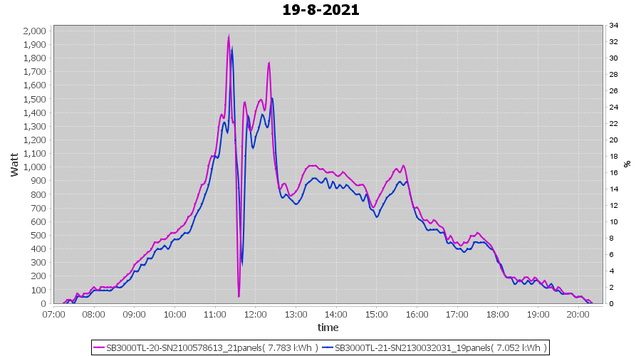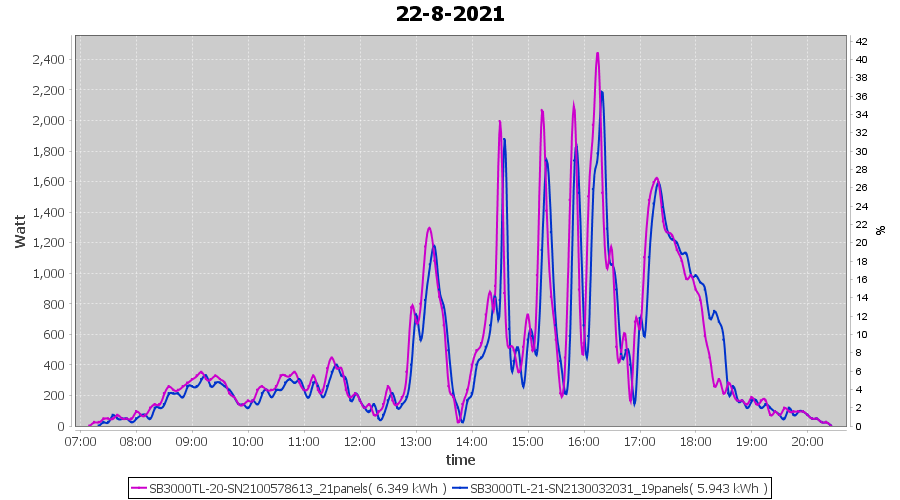 | 22-8-2021 | kWh | Sum | W/Wp | 12.292 | 6000 | 2.0 | 5.685 | € 4.42 | 1.8 |