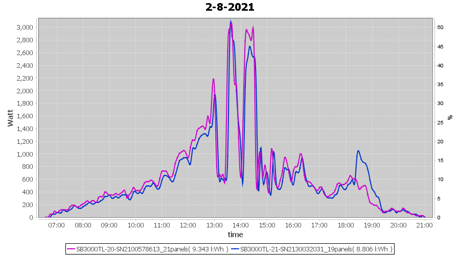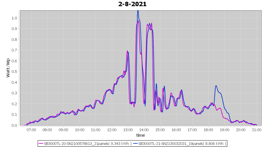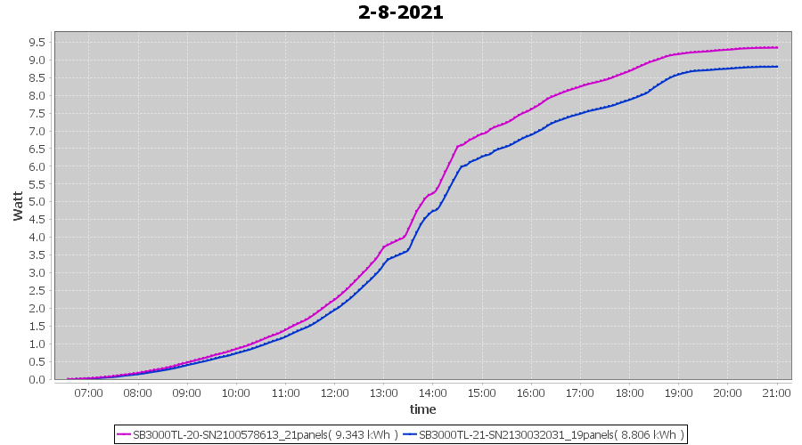 | 2-8-2021 | kWh | Sum | W/Wp | 18.149 | 6000 | 3.0 | 8.394 | € 6.53 | 2.7 |