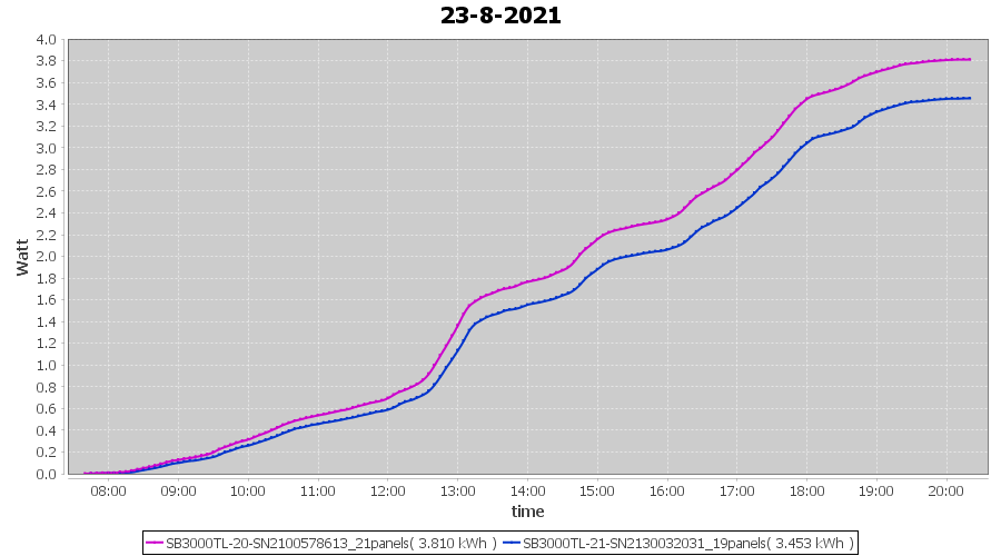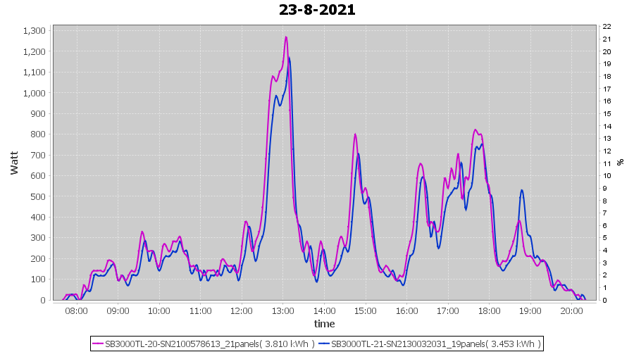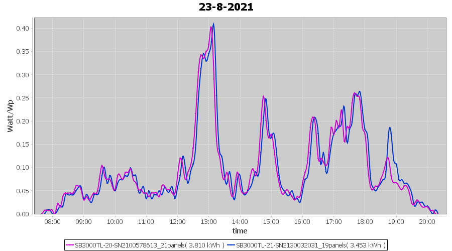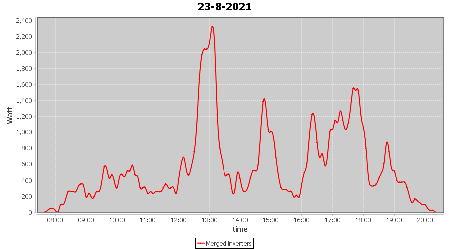 | 23-8-2021 | kWh | Sum | W/Wp | 7.263 | 6000 | 1.2 | 3.359 | € 2.61 | 1.1 |