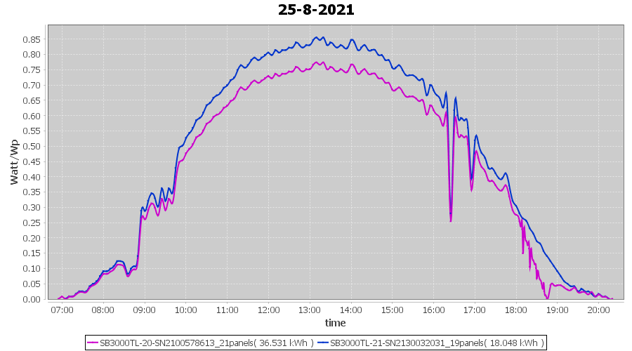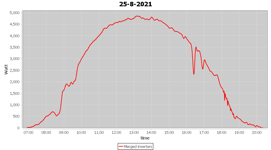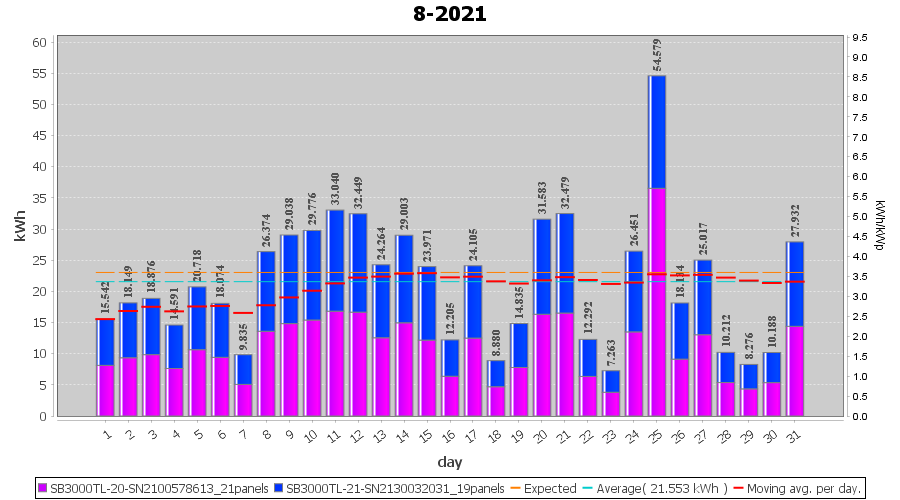 | 25-8-2021 | kWh | Sum | W/Wp | 54.579 | 6000 | 9.1 | 25.243 | € 19.62 | 8.2 |