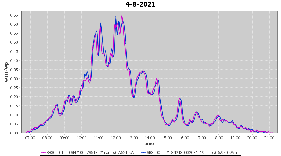 | 4-8-2021 | kWh | Sum | W/Wp | 14.591 | 6000 | 2.4 | 6.748 | € 5.25 | 2.2 |