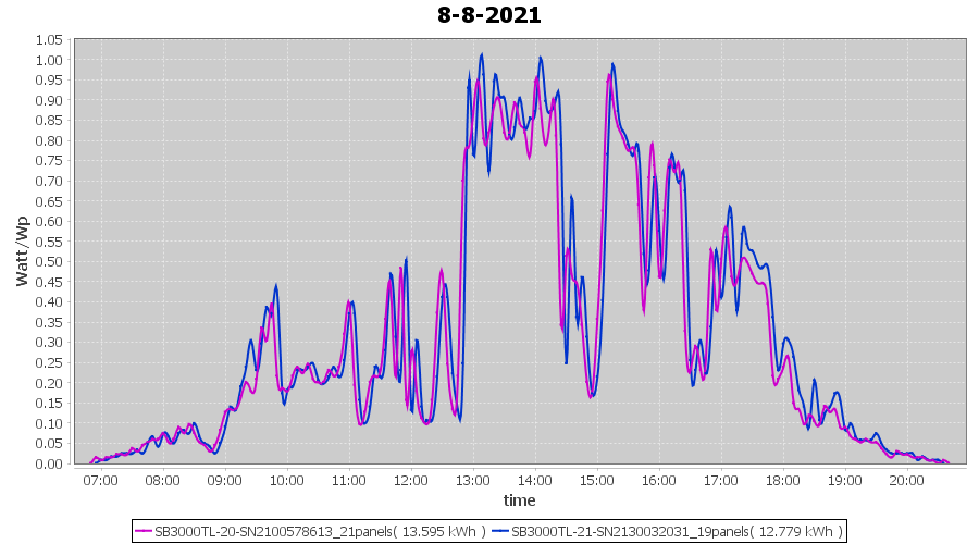 | 8-8-2021 | kWh | Sum | W/Wp | 26.374 | 6000 | 4.4 | 12.198 | € 9.48 | 3.9 |