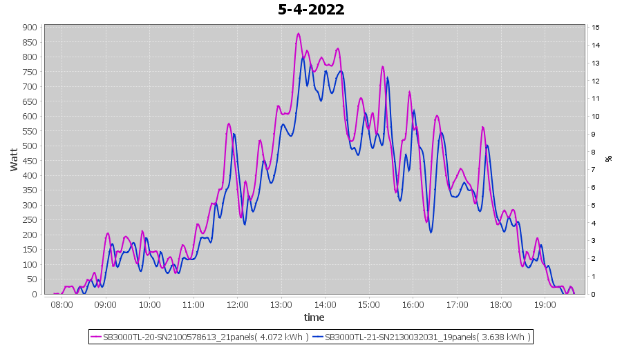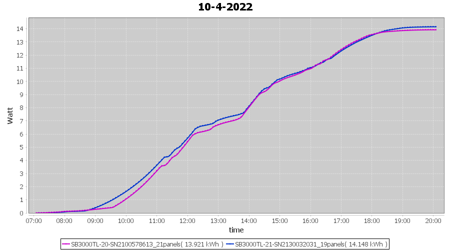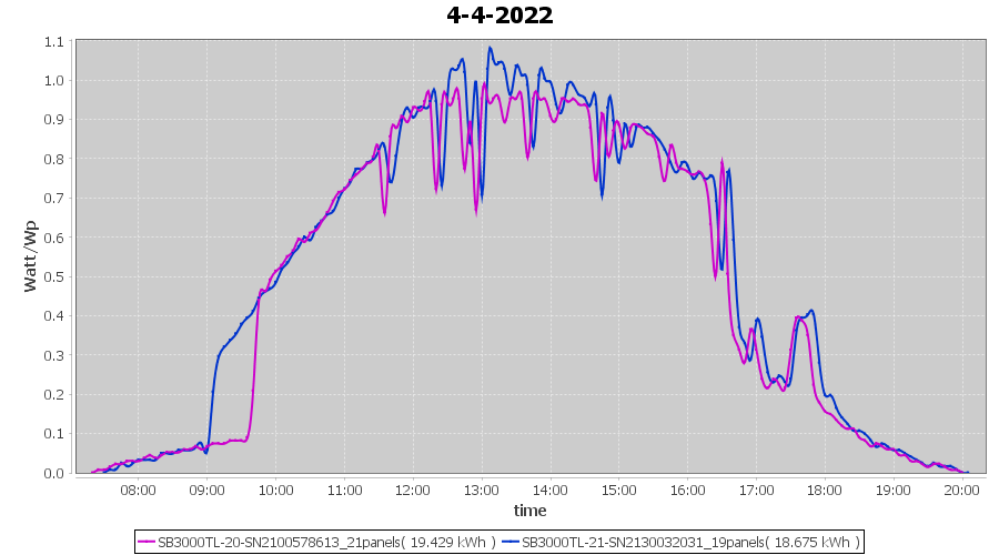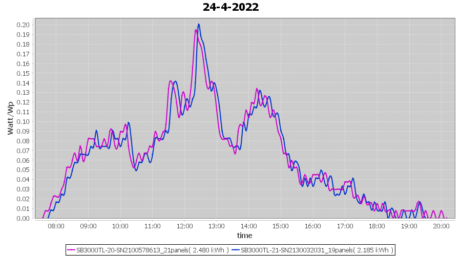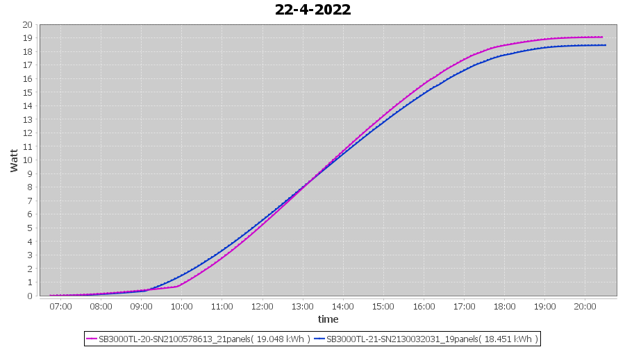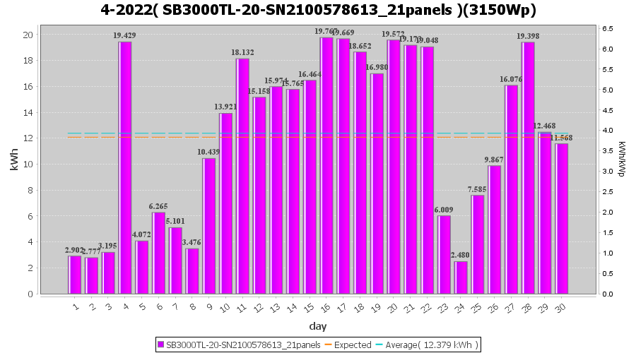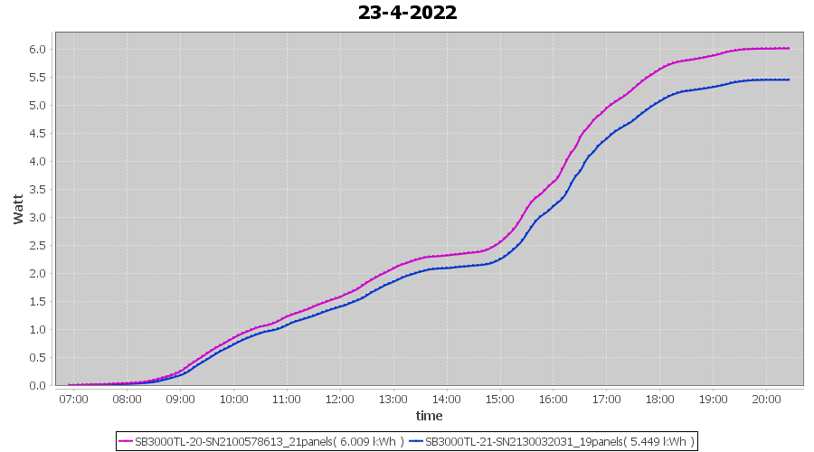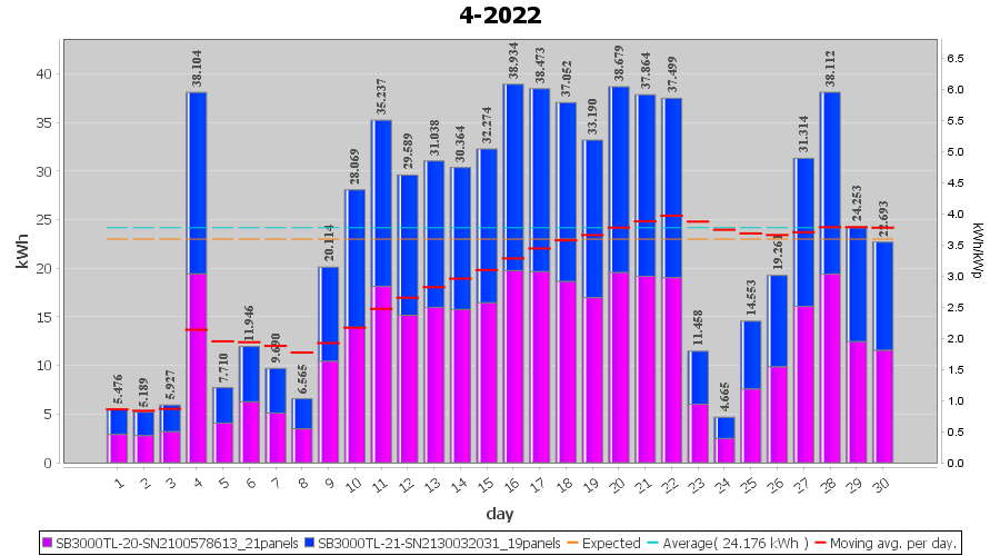 | 20-4-2022 | kWh | Sum | W/Wp | 38.679 | 6000 | 6.4 | 17.889 | € 14.03 | 5.3 |