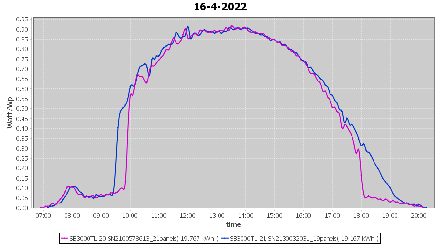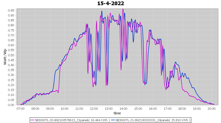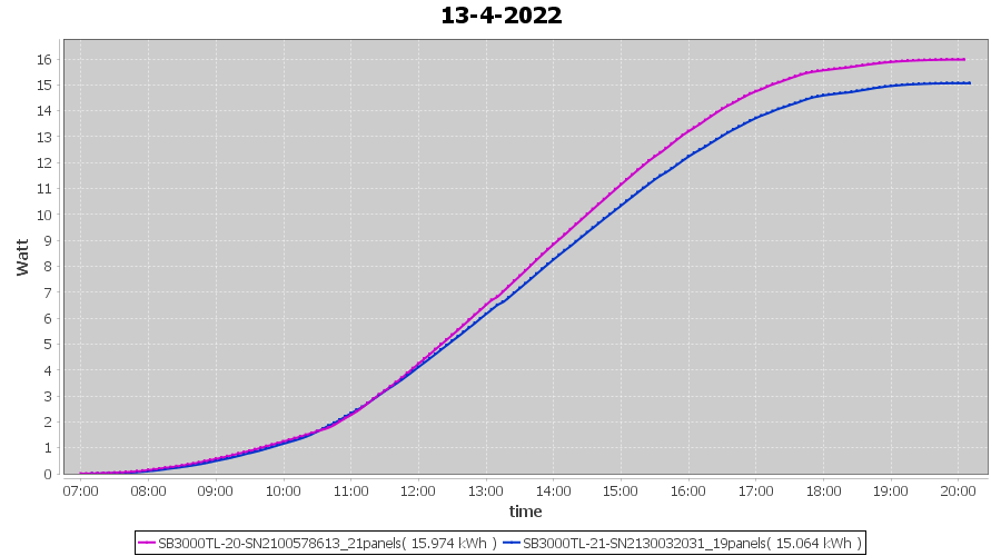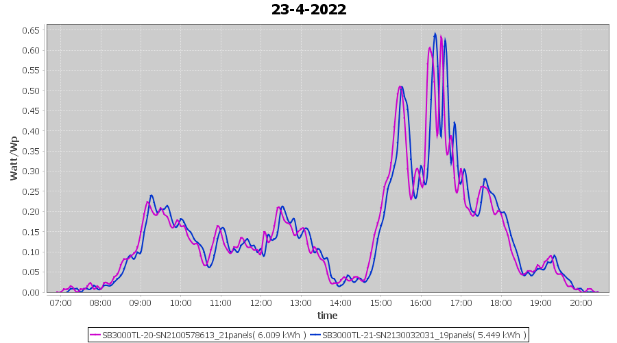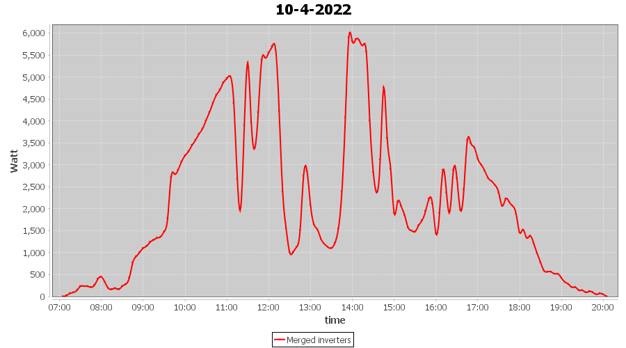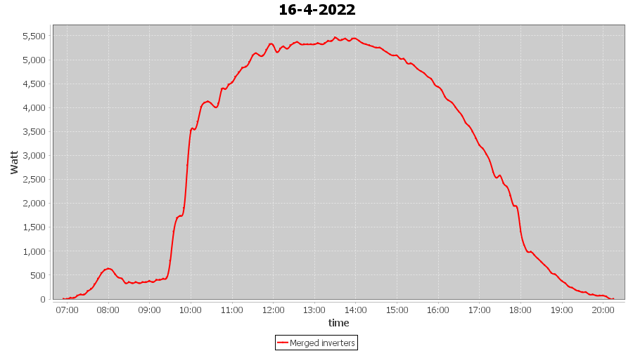 | 16-4-2022 | kWh | Sum | W/Wp | 38.934 | 6000 | 6.5 | 18.007 | € 14.12 | 5.4 |