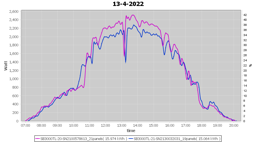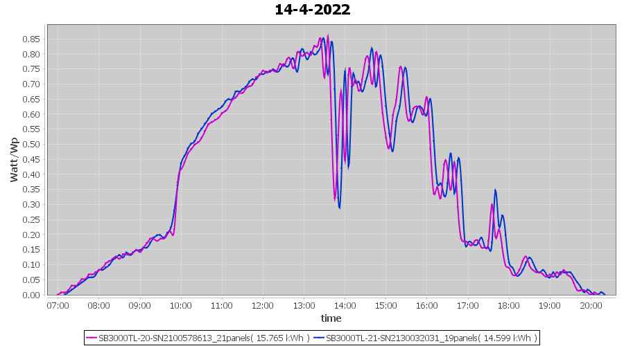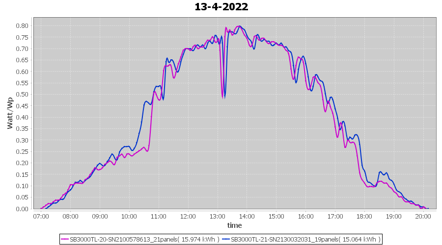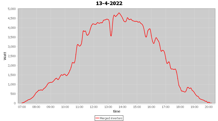 | 13-4-2022 | kWh | Sum | W/Wp | 31.038 | 6000 | 5.2 | 14.355 | € 11.26 | 4.3 |