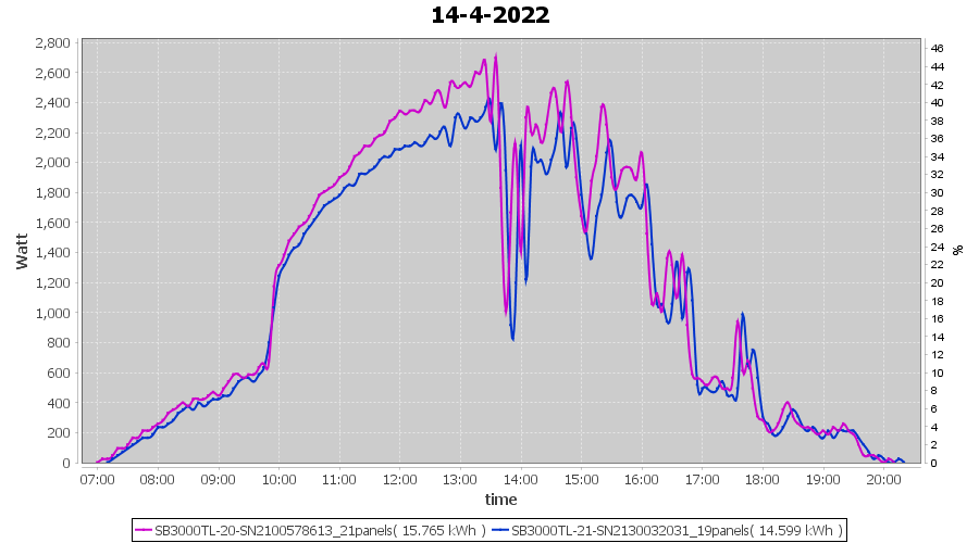 | 14-4-2022 | kWh | Sum | W/Wp | 30.364 | 6000 | 5.1 | 14.043 | € 11.01 | 4.2 |