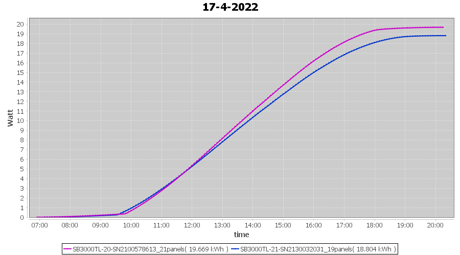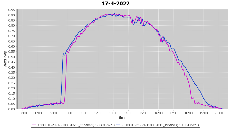 | 17-4-2022 | kWh | Sum | W/Wp | 38.473 | 6000 | 6.4 | 17.794 | € 13.95 | 5.3 |