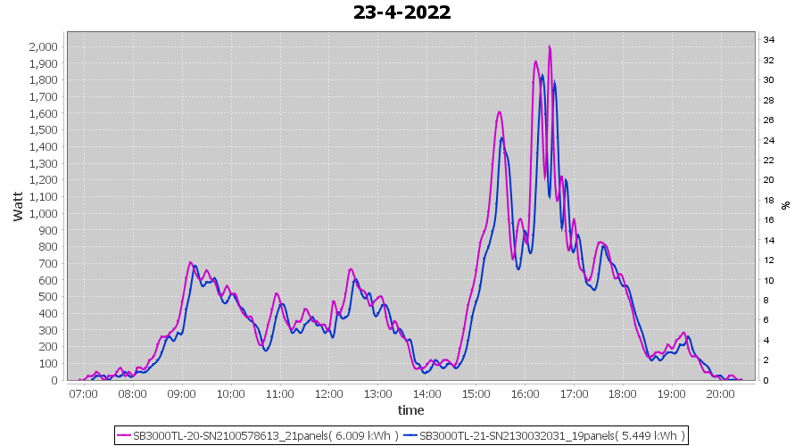 | 23-4-2022 | kWh | Sum | W/Wp | 11.458 | 6000 | 1.9 | 5.299 | € 4.16 | 1.6 |