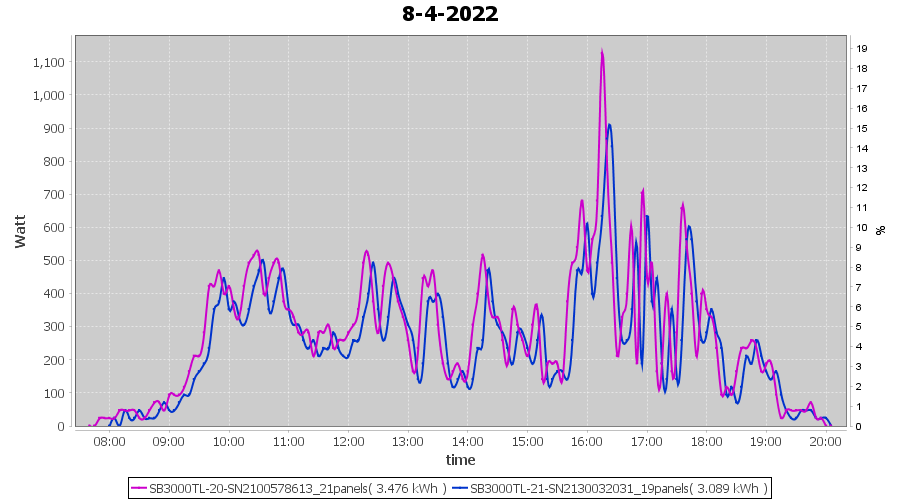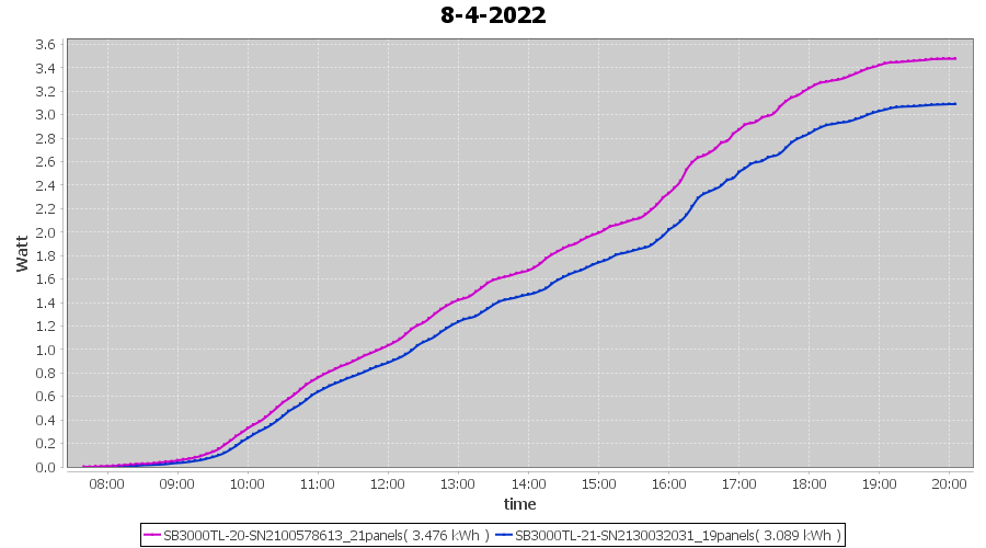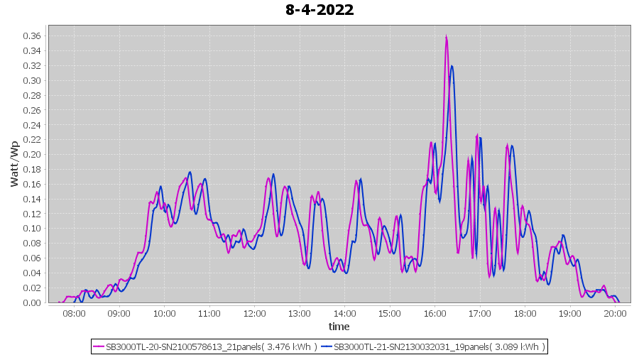 | 8-4-2022 | kWh | Sum | W/Wp | 6.565 | 6000 | 1.1 | 3.036 | € 2.38 | 0.9 |
