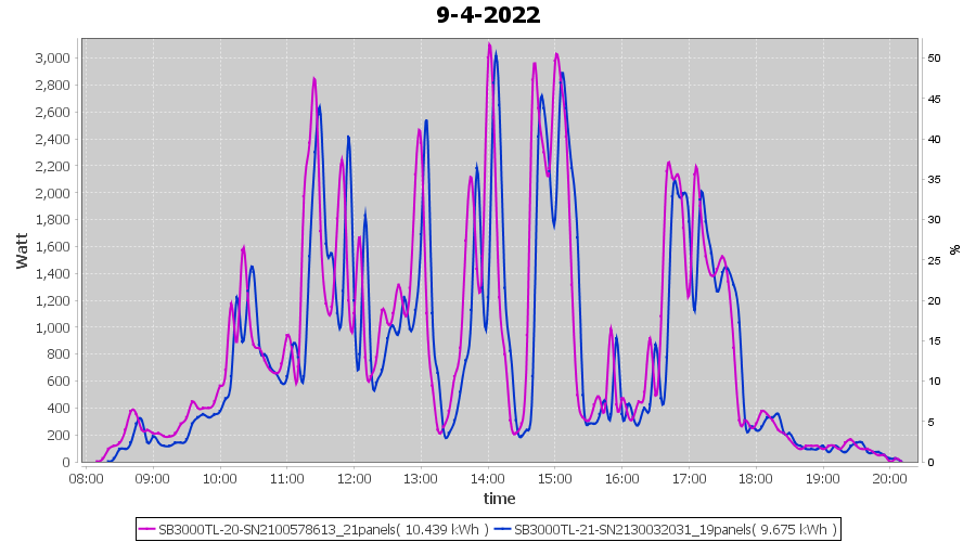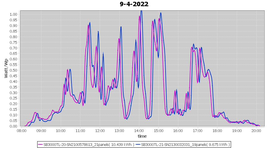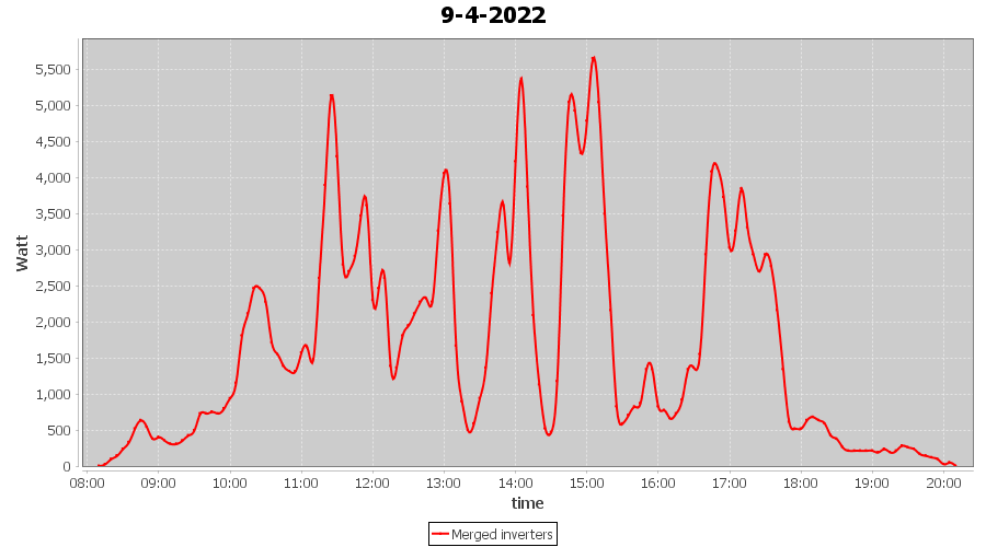 | 9-4-2022 | kWh | Sum | W/Wp | 20.114 | 6000 | 3.4 | 9.303 | € 7.30 | 2.8 |