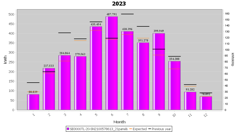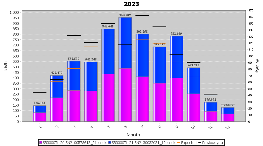 | Month | Yield (kWh) | Wp | kWh/kWp | Co2 (Kg) | Savings | % |