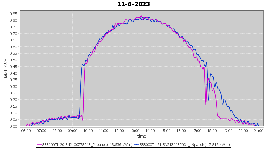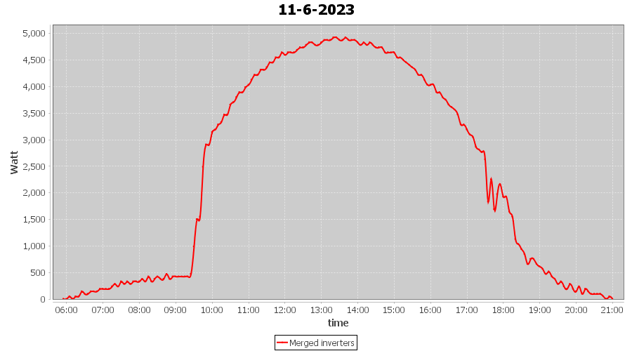 | 11-6-2023 | kWh | Sum | W/Wp | 36.448 | 6000 | 6.1 | 16.857 | € 13.61 | 3.8 |