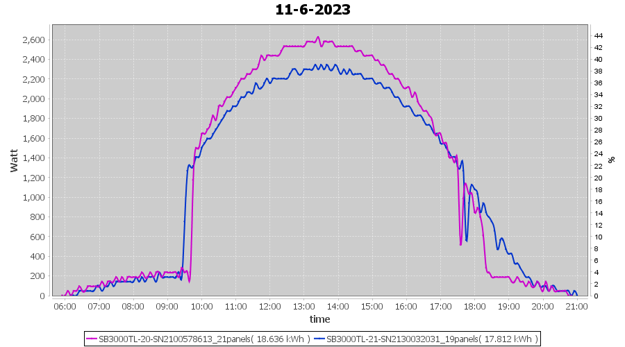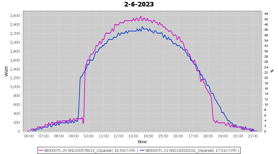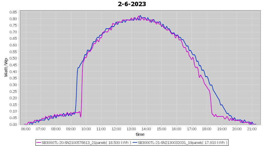 | 2-6-2023 | kWh | Sum | W/Wp | 36.410 | 6000 | 6.1 | 16.840 | € 13.59 | 3.8 |