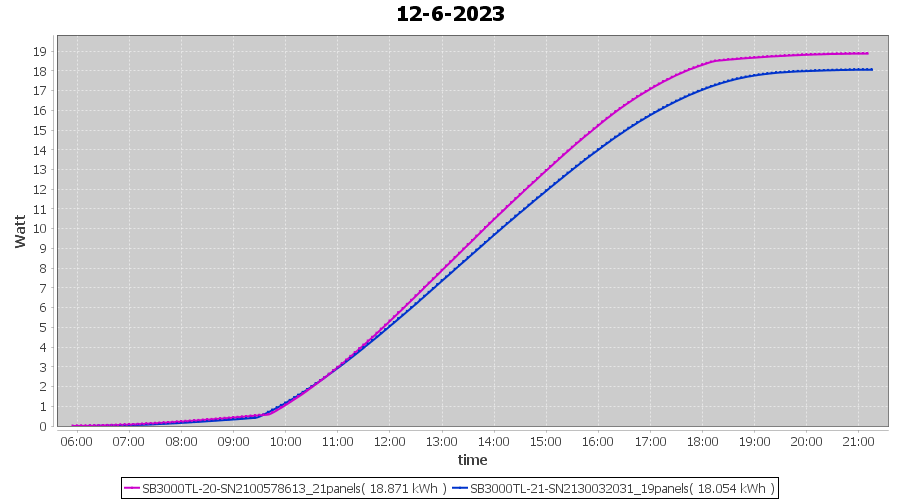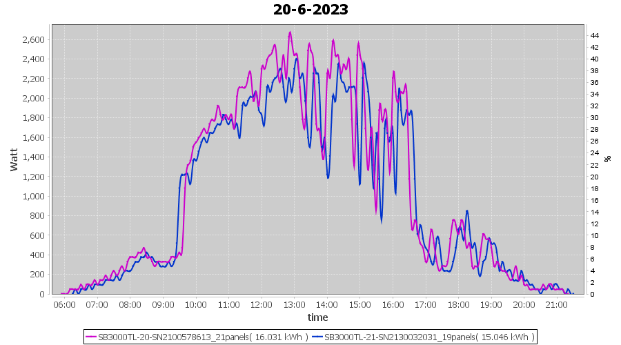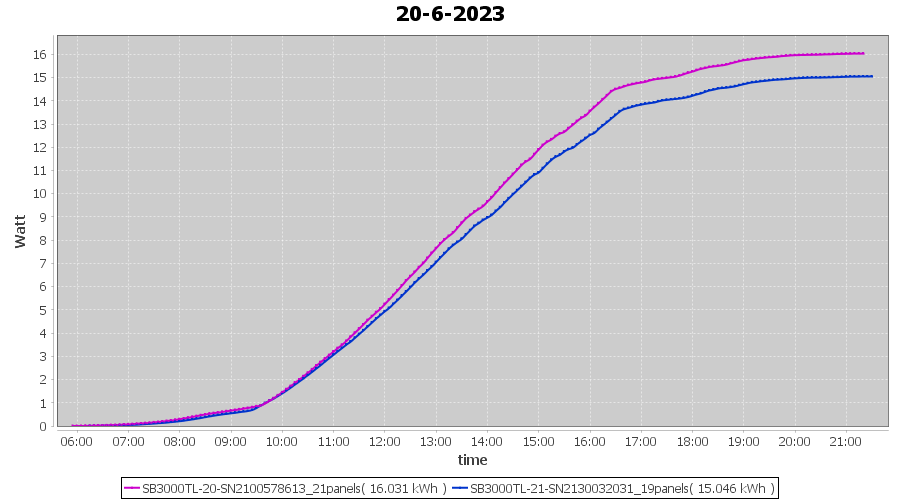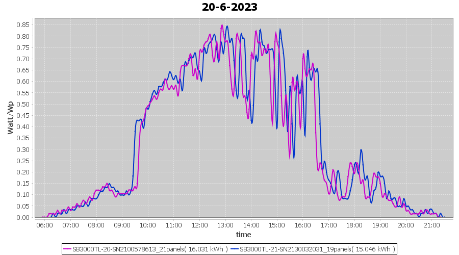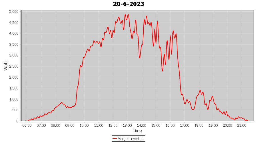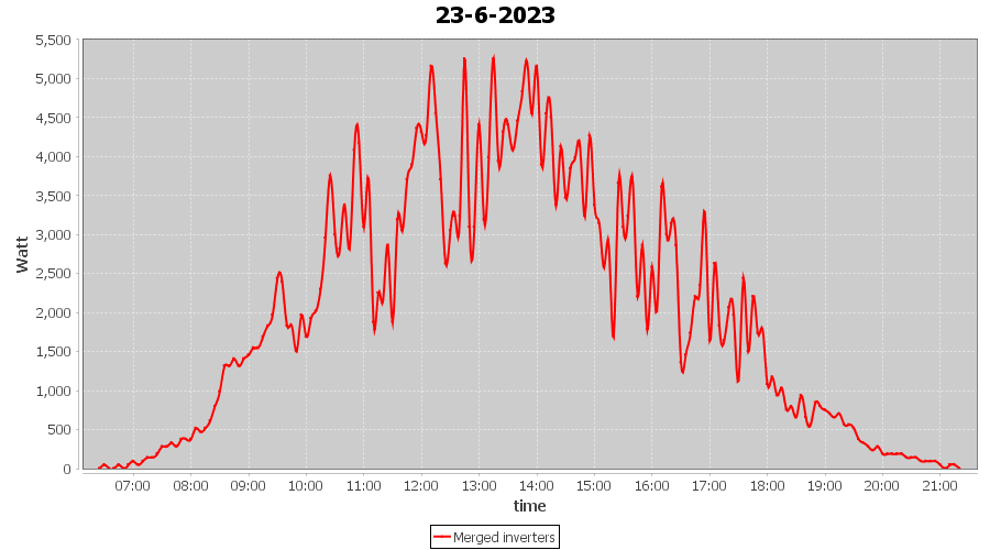 | 20-6-2023 | kWh | Sum | W/Wp | 31.077 | 6000 | 5.2 | 14.373 | € 11.60 | 3.3 |
