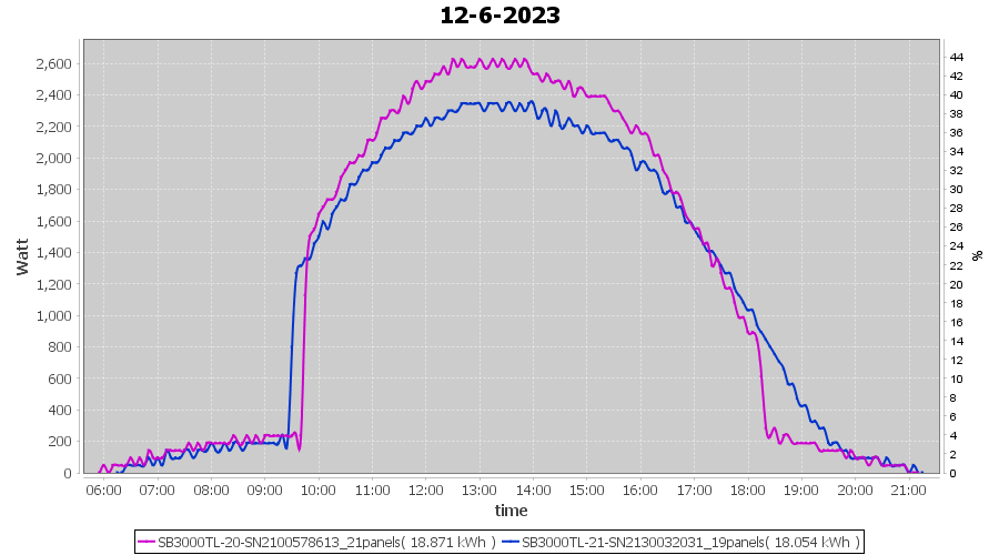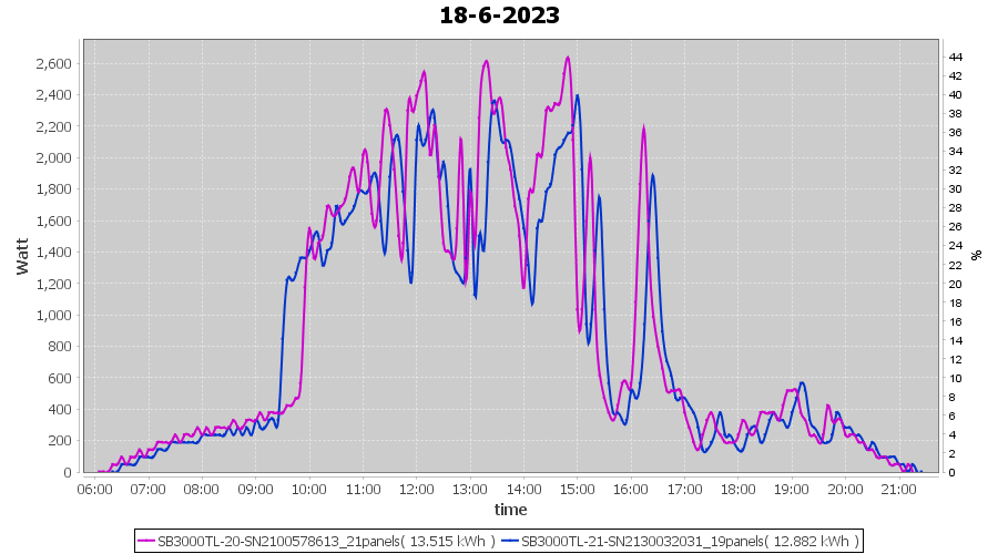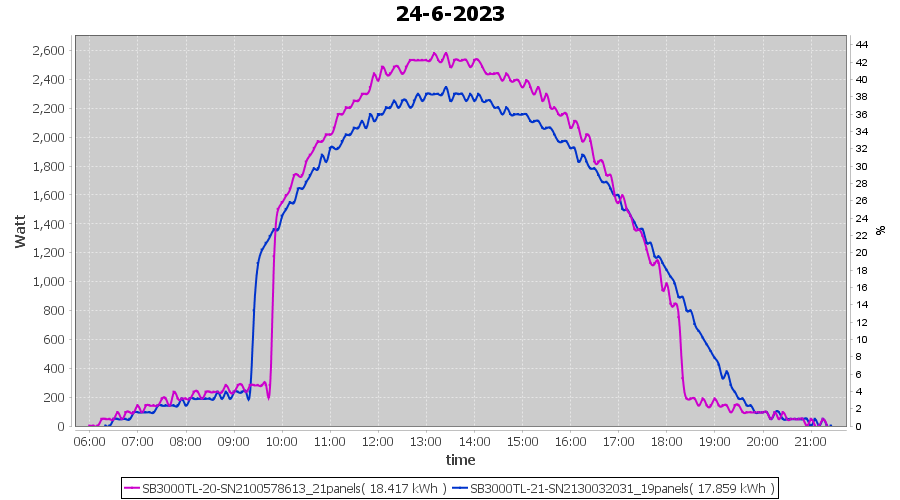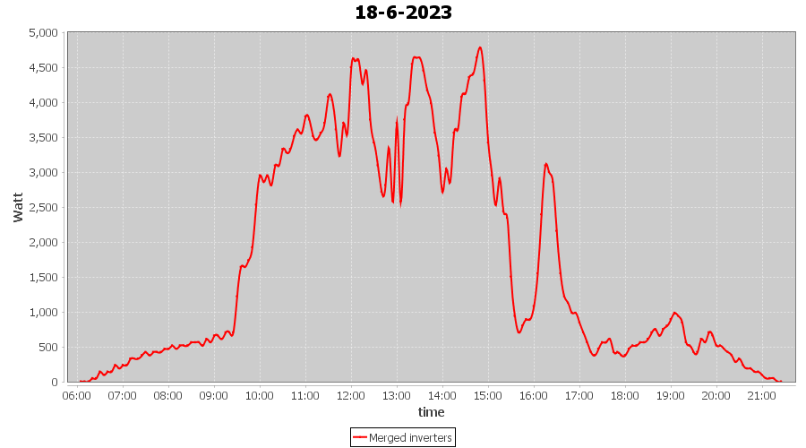 | 18-6-2023 | kWh | Sum | W/Wp | 26.397 | 6000 | 4.4 | 12.209 | € 9.85 | 2.8 |
