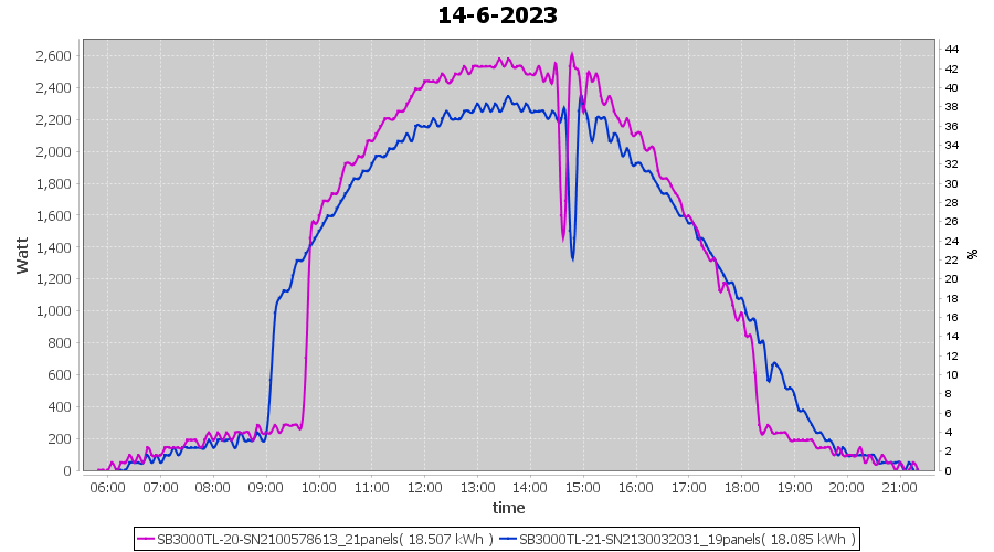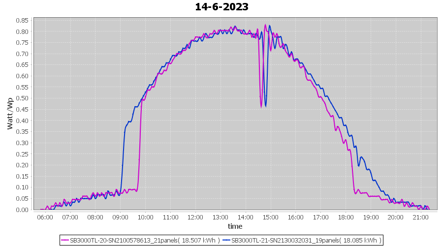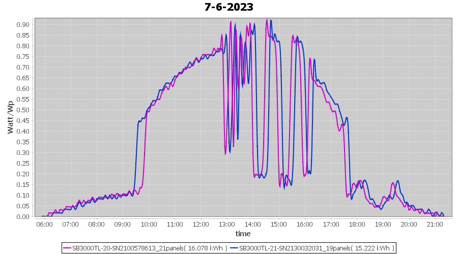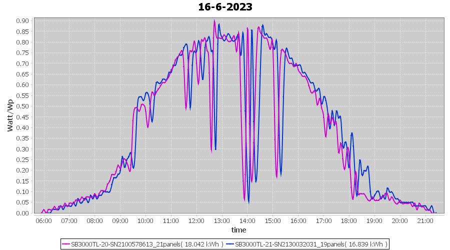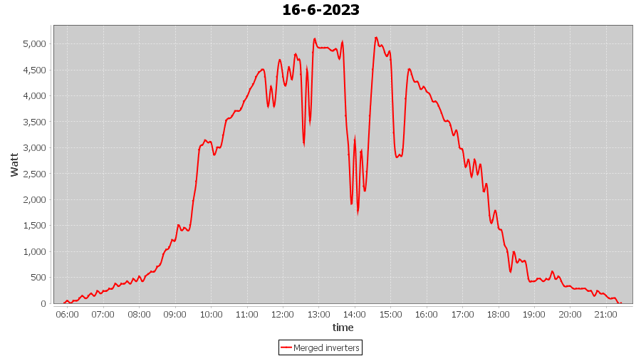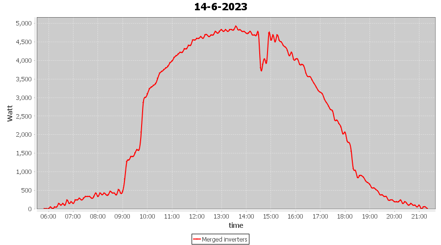 | 14-6-2023 | kWh | Sum | W/Wp | 36.592 | 6000 | 6.1 | 16.924 | € 13.66 | 3.8 |