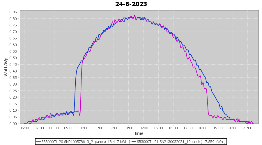 | 24-6-2023 | kWh | Sum | W/Wp | 36.276 | 6000 | 6.0 | 16.778 | € 13.54 | 3.8 |