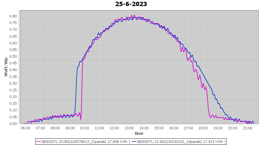 | 23-6-2023 | kWh | Sum | W/Wp | 29.799 | 6000 | 5.0 | 13.782 | € 11.12 | 3.1 |