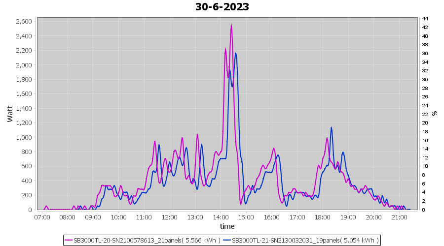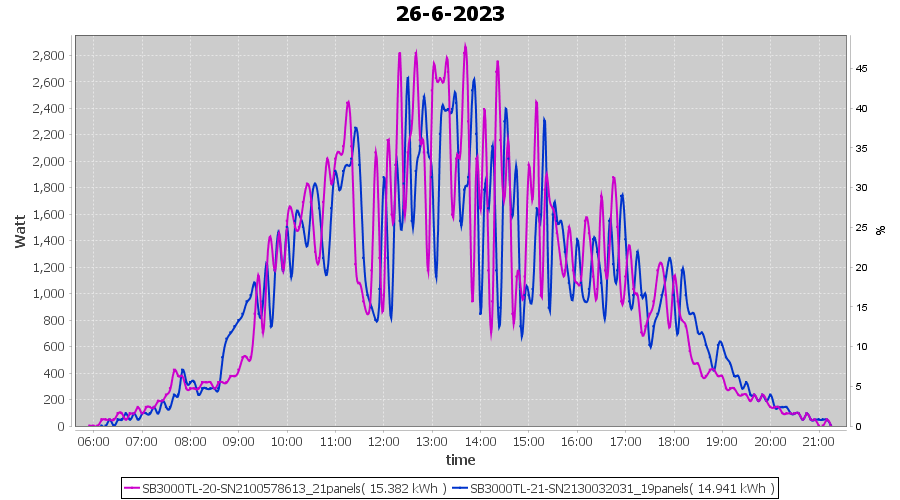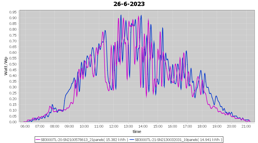 | 26-6-2023 | kWh | Sum | W/Wp | 30.323 | 6000 | 5.1 | 14.024 | € 11.32 | 3.2 |