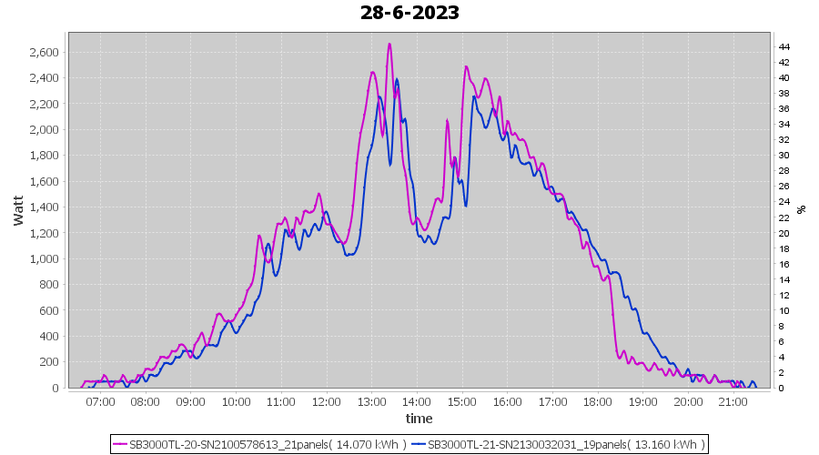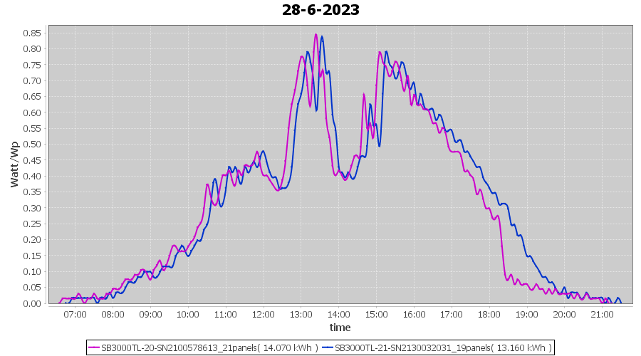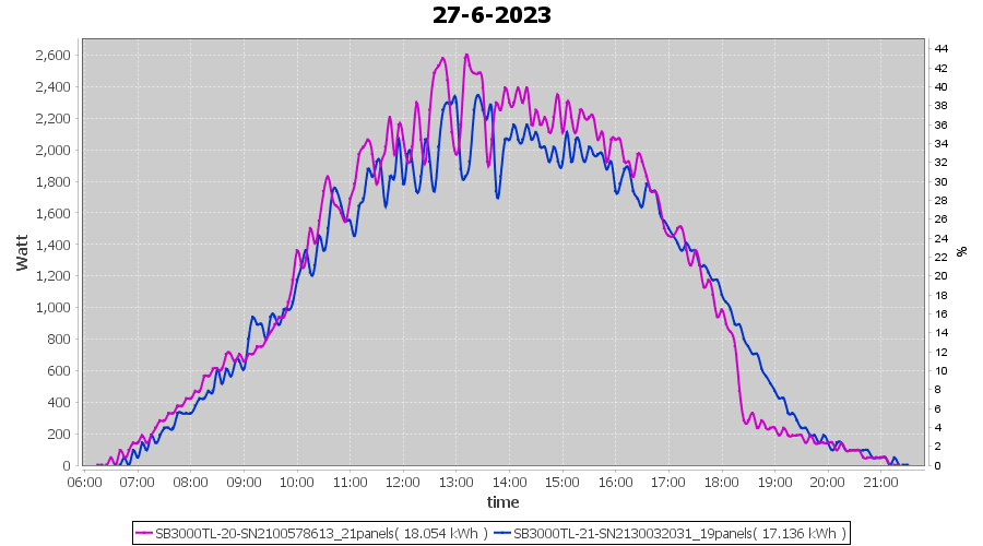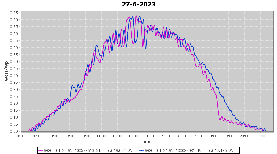 | 27-6-2023 | kWh | Sum | W/Wp | 35.190 | 6000 | 5.9 | 16.275 | € 13.14 | 3.7 |