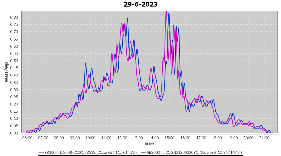 | 29-6-2023 | kWh | Sum | W/Wp | 22.608 | 6000 | 3.8 | 10.456 | € 8.44 | 2.4 |