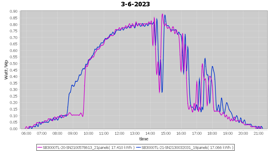 | 3-6-2023 | kWh | Sum | W/Wp | 34.476 | 6000 | 5.7 | 15.945 | € 12.87 | 3.6 |