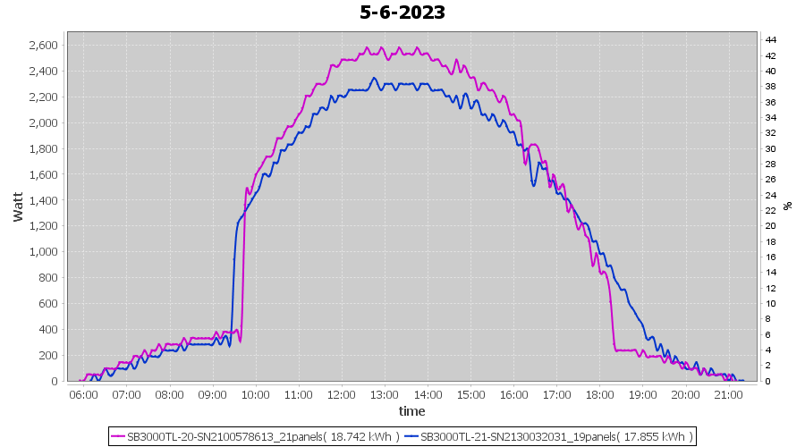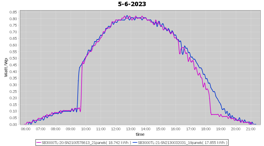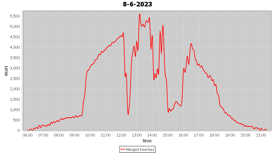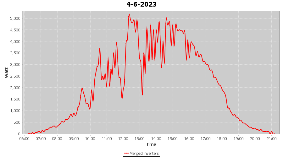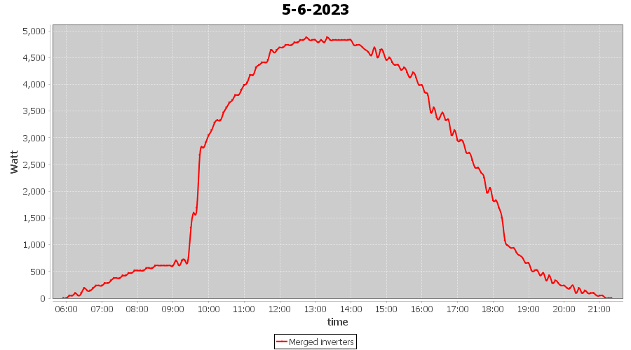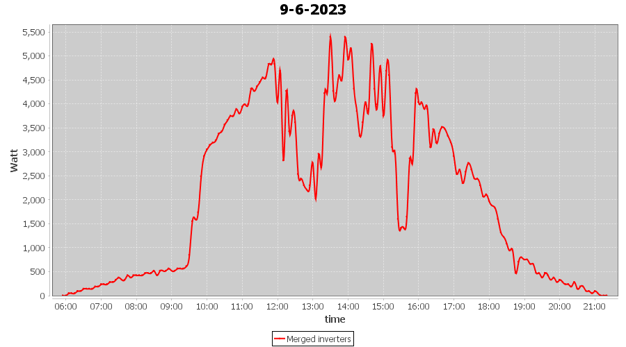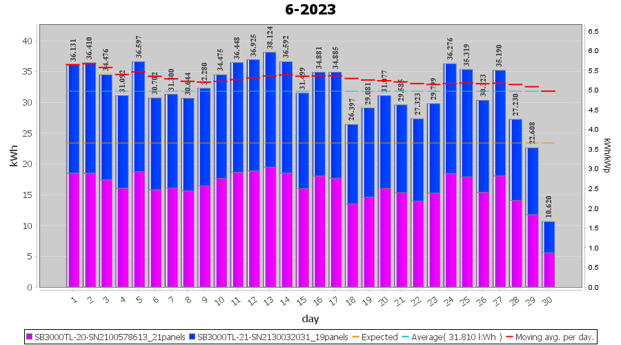 | 5-6-2023 | kWh | Sum | W/Wp | 36.597 | 6000 | 6.1 | 16.926 | € 13.66 | 3.8 |