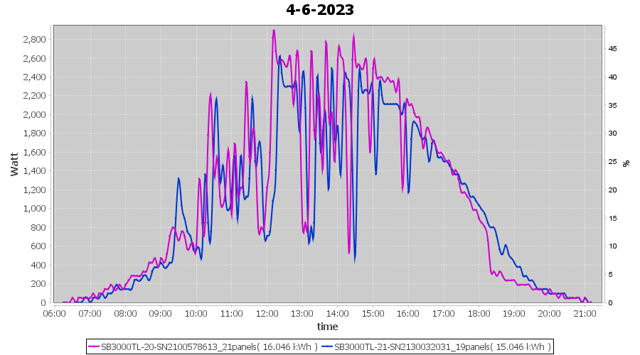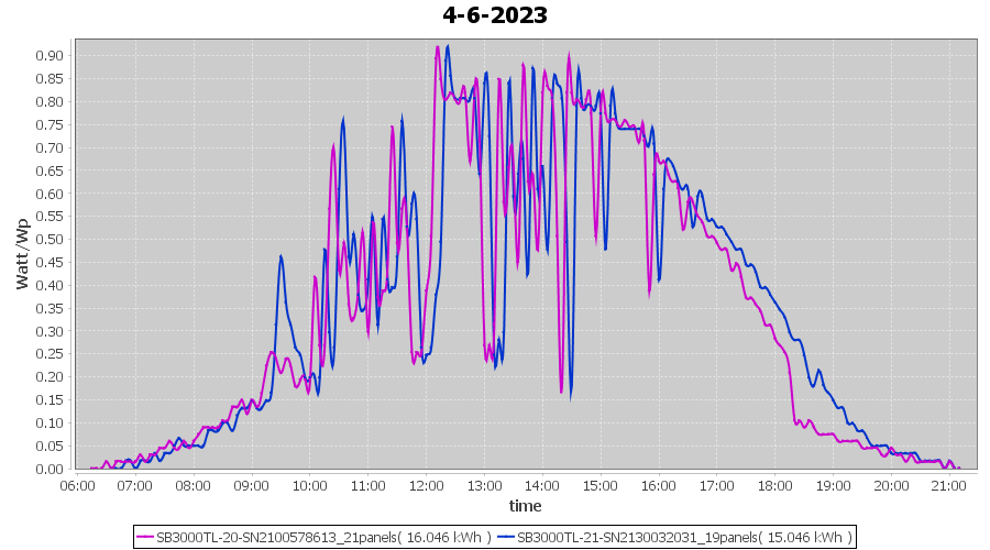 | 4-6-2023 | kWh | Sum | W/Wp | 31.092 | 6000 | 5.2 | 14.380 | € 11.61 | 3.3 |
