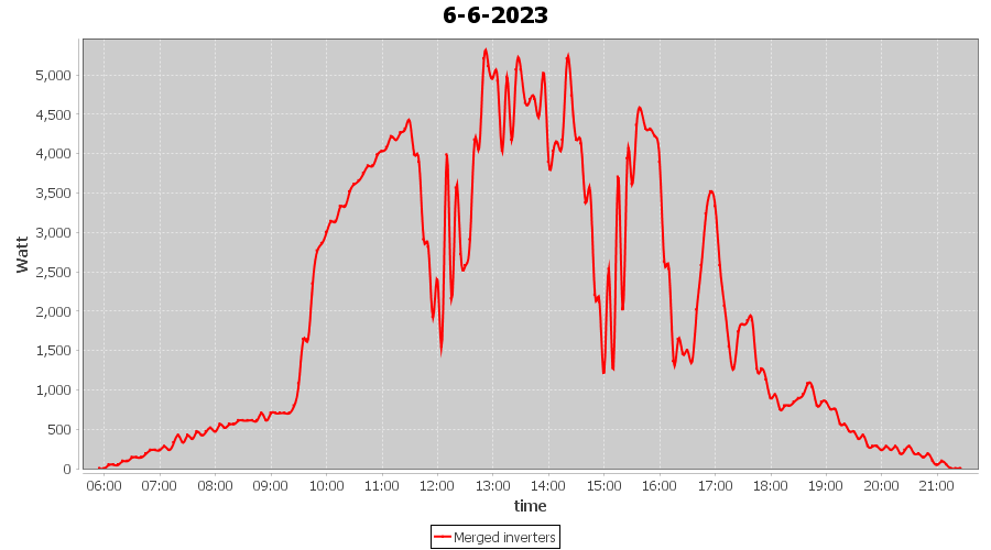 | 6-6-2023 | kWh | Sum | W/Wp | 30.702 | 6000 | 5.1 | 14.200 | € 11.46 | 3.2 |