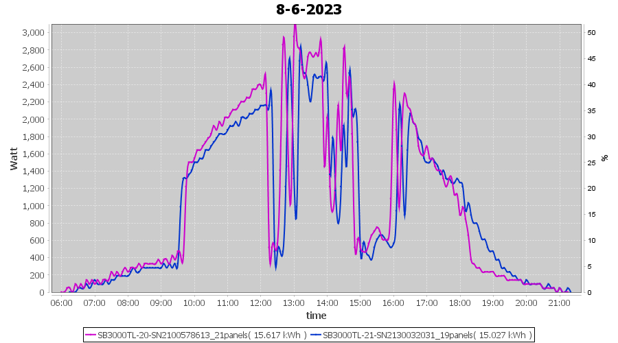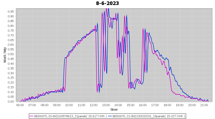 | 8-6-2023 | kWh | Sum | W/Wp | 30.644 | 6000 | 5.1 | 14.173 | € 11.44 | 3.2 |