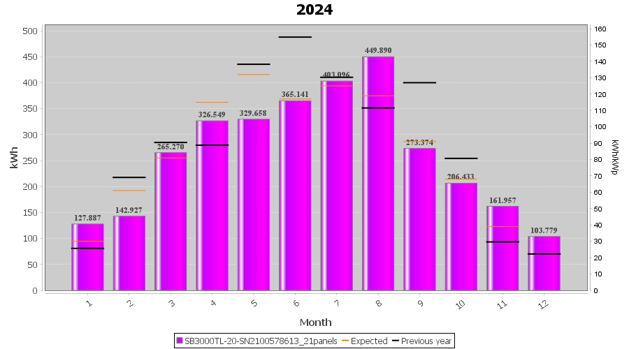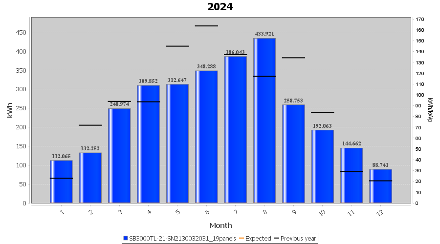 | Month | Yield (kWh) | Wp | kWh/kWp | Co2 (Kg) | Savings | % |