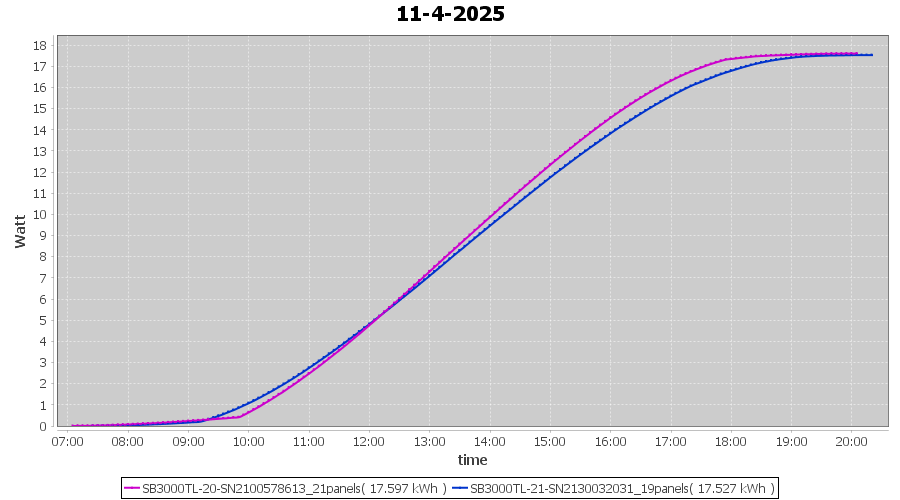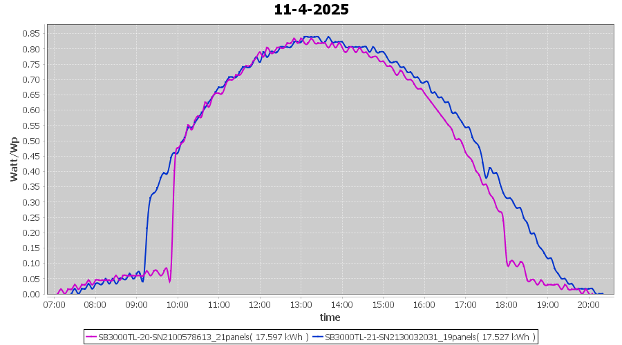 | 11-4-2025 | kWh | Sum | W/Wp | 35.124 | 6000 | 5.9 | 16.245 | € 13.17 | 4.7 |