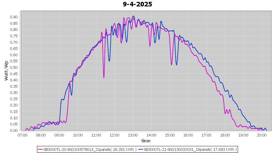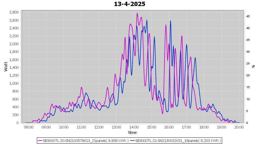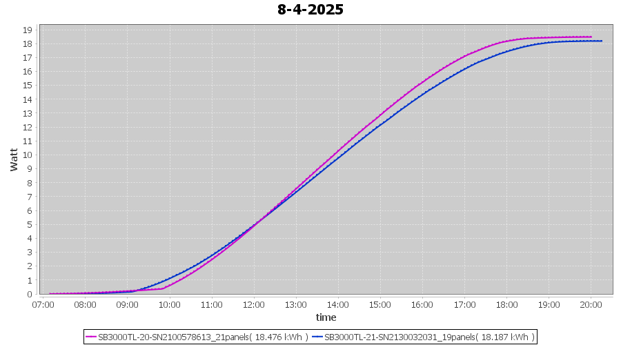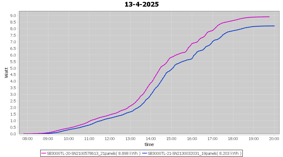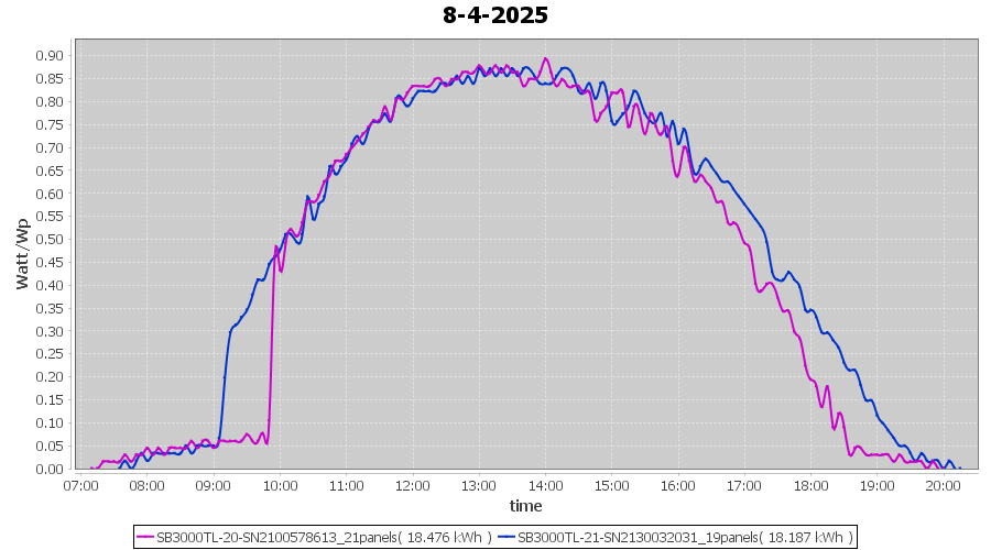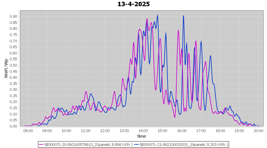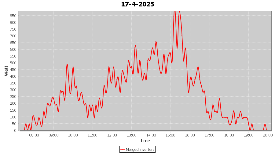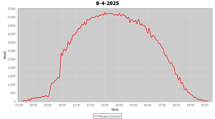| 8-4-2025 | kWh | Sum | W/Wp | 36.663 | 6000 | 6.1 | 16.957 | € 13.75 | 4.9 |