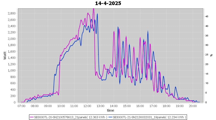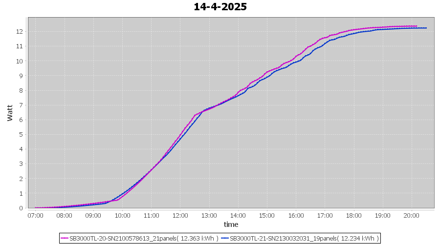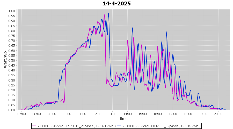 | 14-4-2025 | kWh | Sum | W/Wp | 24.597 | 6000 | 4.1 | 11.376 | € 9.22 | 3.3 |