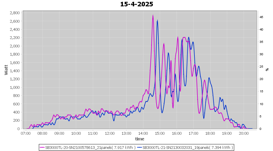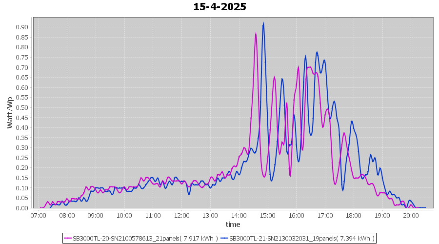 | 15-4-2025 | kWh | Sum | W/Wp | 15.311 | 6000 | 2.6 | 7.081 | € 5.74 | 2.0 |