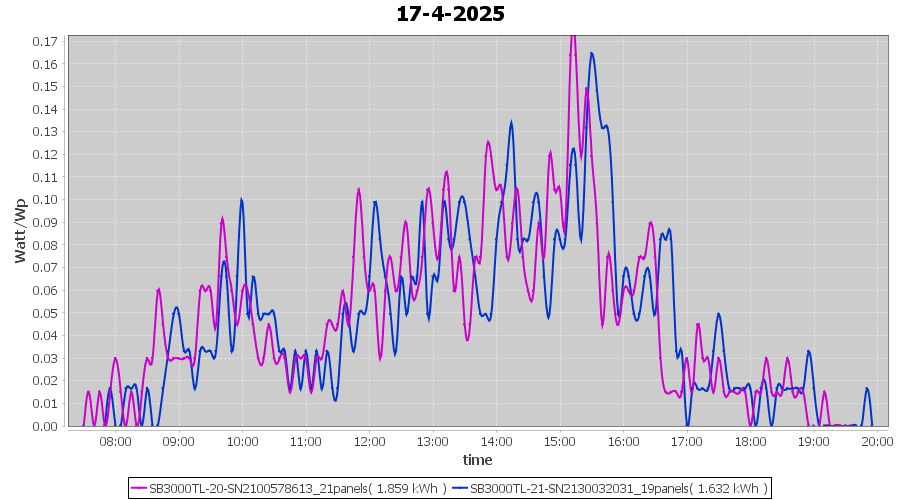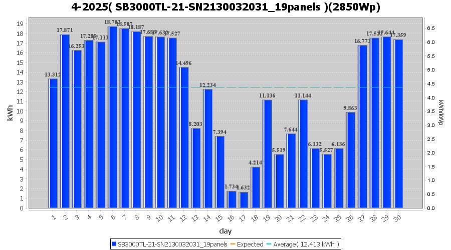 | 13-4-2025 | kWh | Sum | W/Wp | 17.101 | 6000 | 2.9 | 7.909 | € 6.41 | 2.3 |
