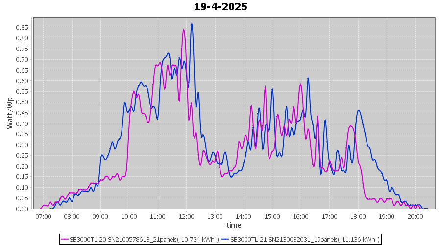 | 19-4-2025 | kWh | Sum | W/Wp | 21.870 | 6000 | 3.6 | 10.115 | € 8.20 | 2.9 |