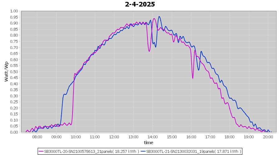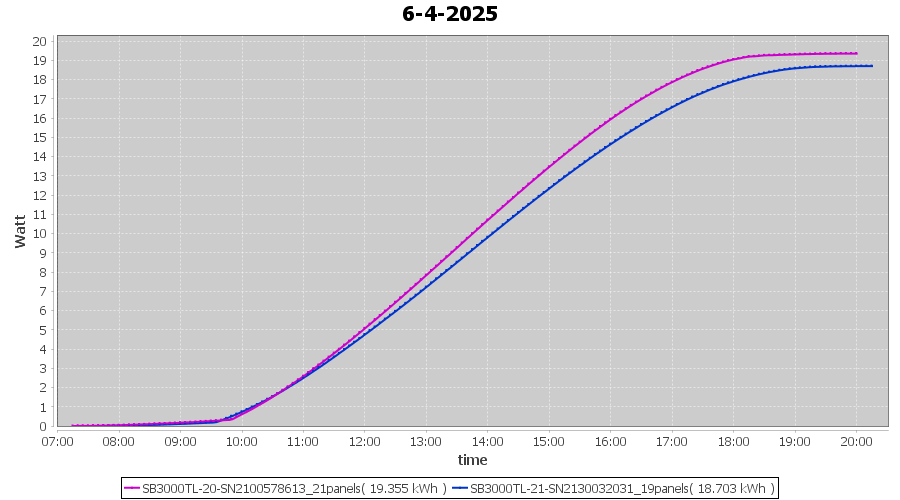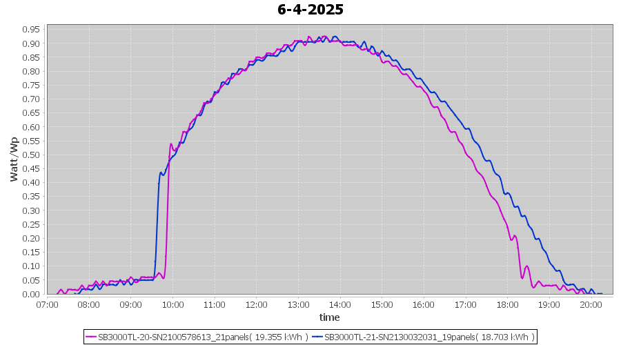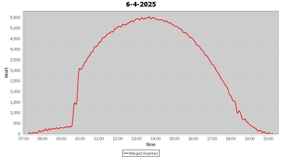 | 6-4-2025 | kWh | Sum | W/Wp | 38.058 | 6000 | 6.3 | 17.602 | € 14.27 | 5.0 |