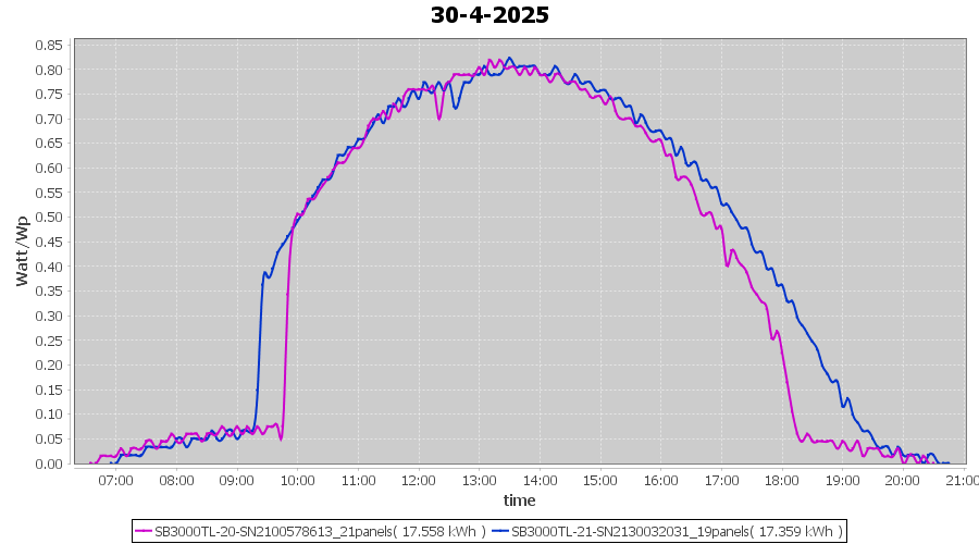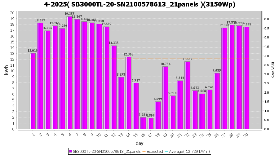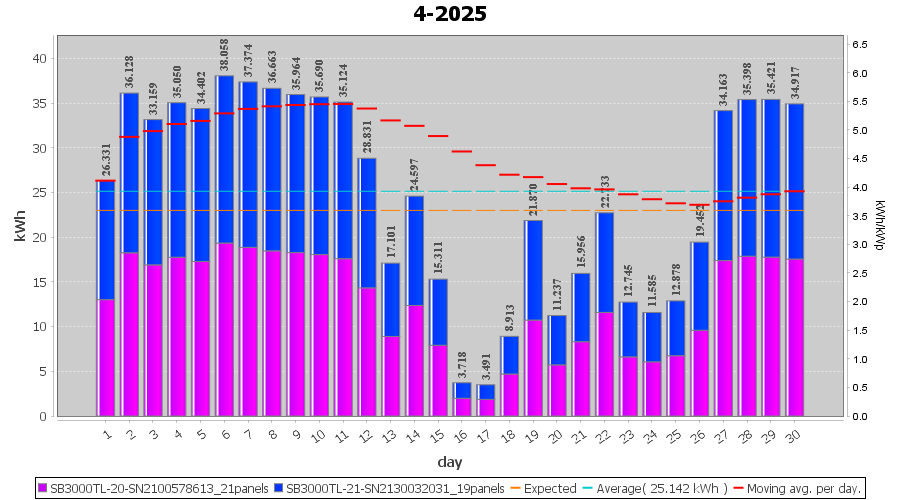 | 30-4-2025 | kWh | Sum | W/Wp | 34.917 | 6000 | 5.8 | 16.149 | € 13.09 | 4.6 |