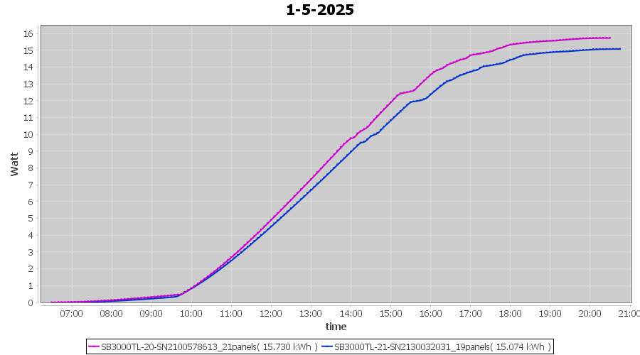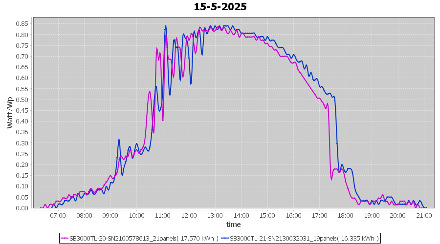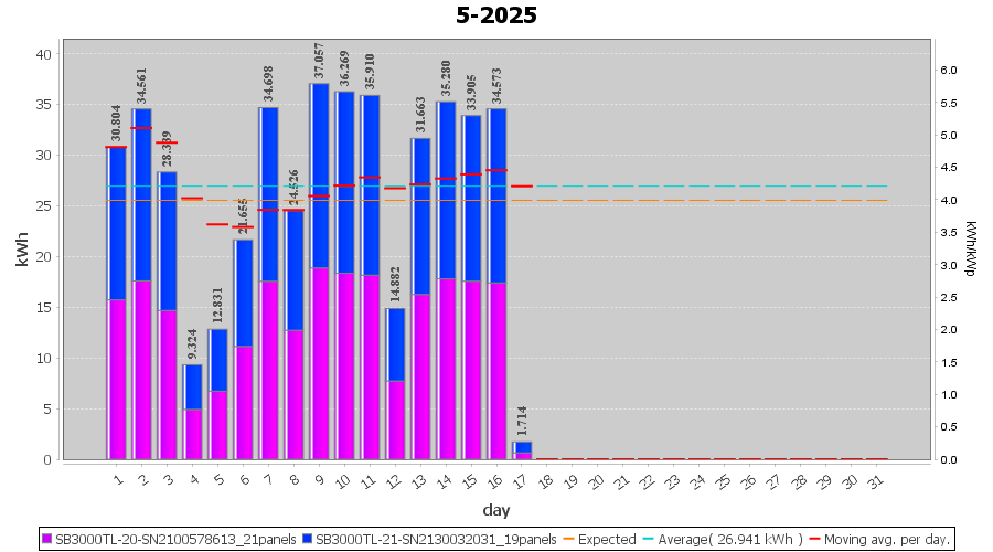 | 15-5-2025 | kWh | Sum | W/Wp | 33.905 | 6000 | 5.7 | 15.681 | € 12.71 | 7.4 |