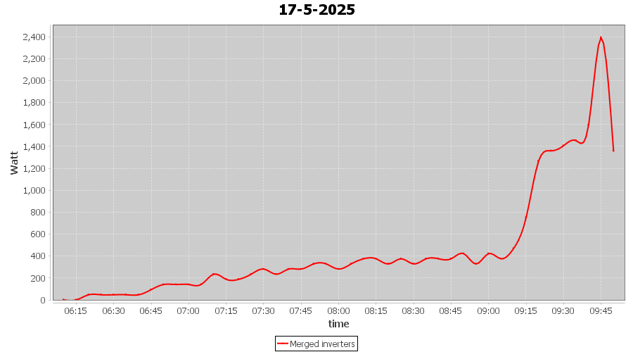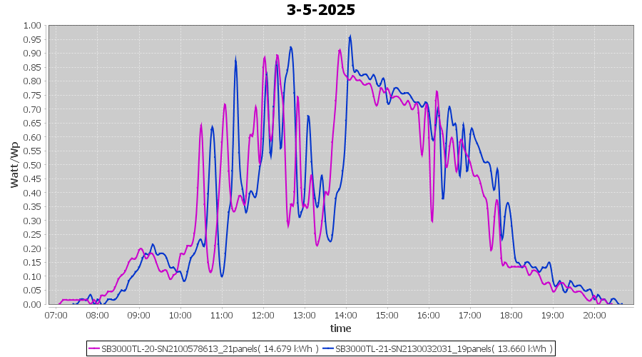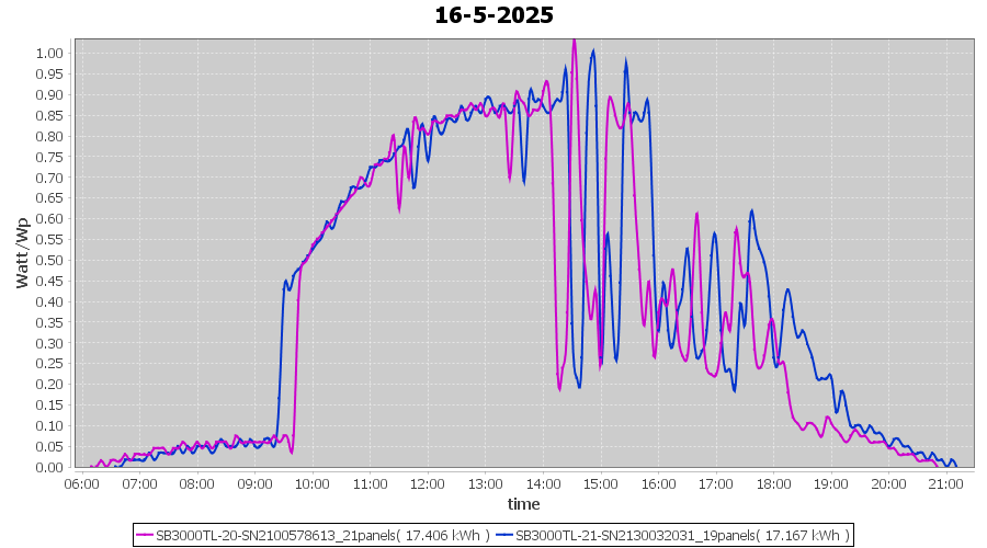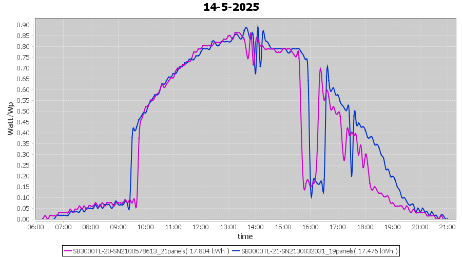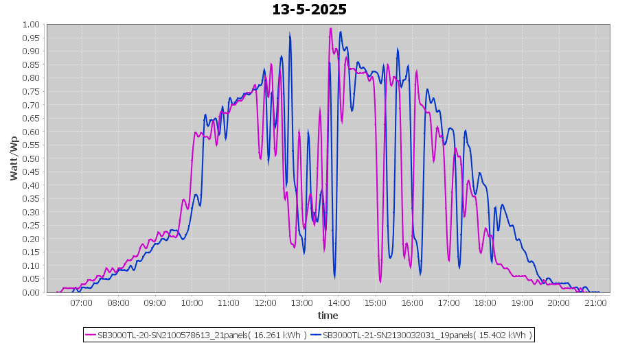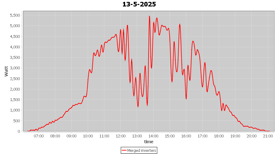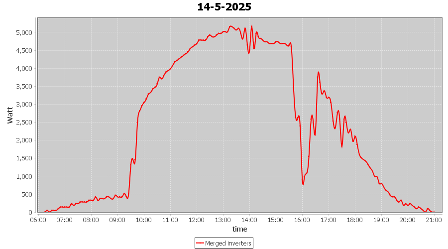 | 14-5-2025 | kWh | Sum | W/Wp | 35.280 | 6000 | 5.9 | 16.317 | € 13.23 | 7.7 |