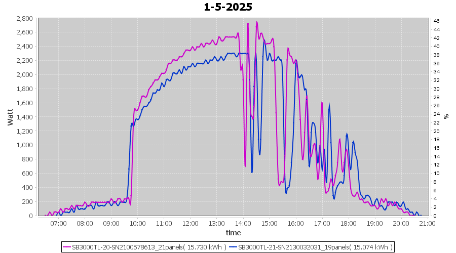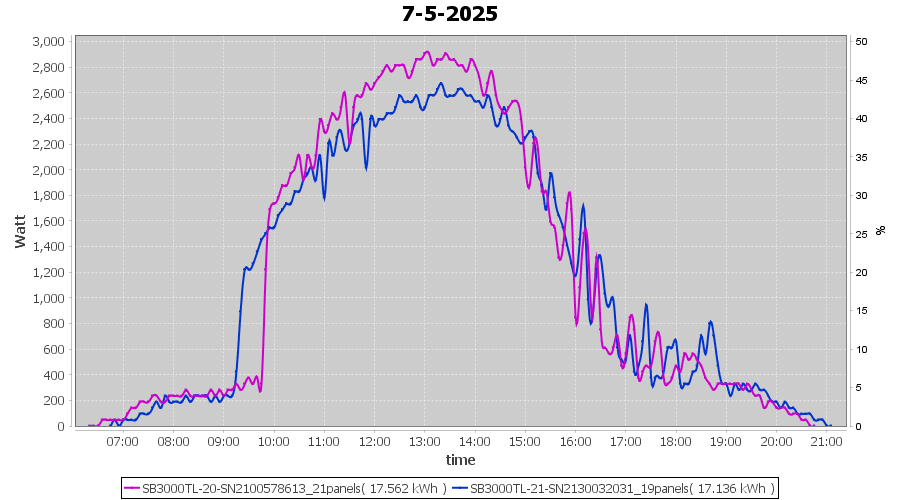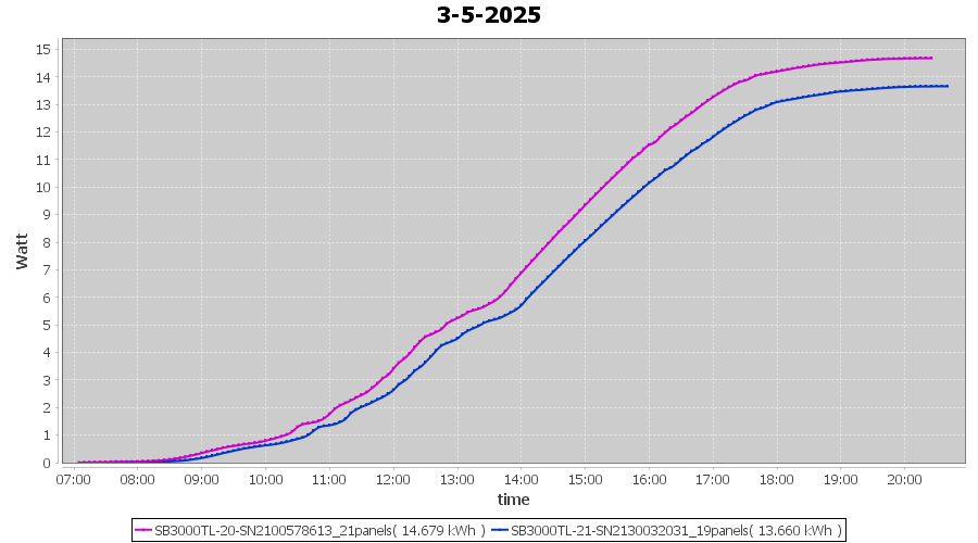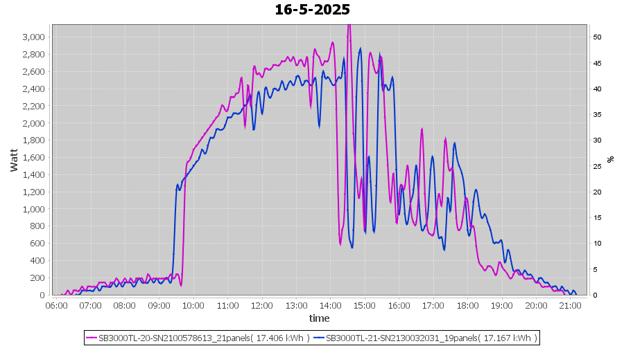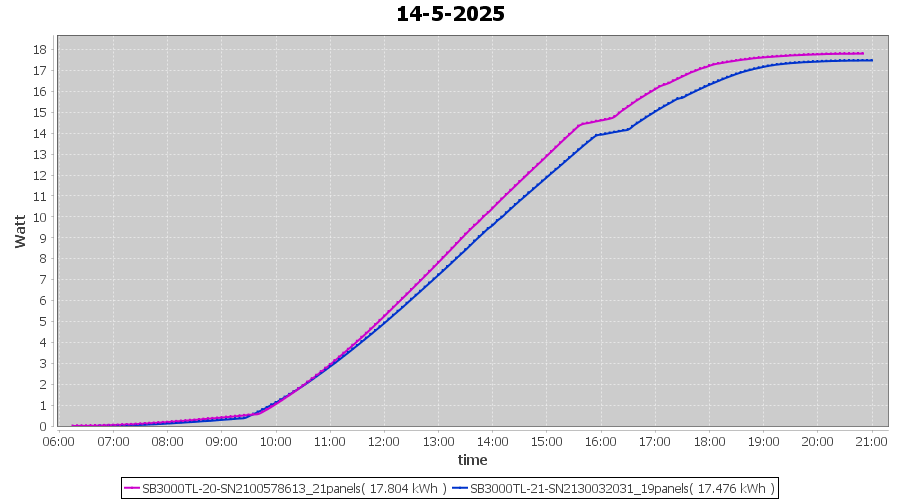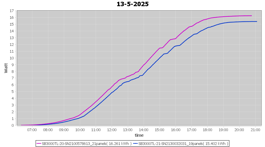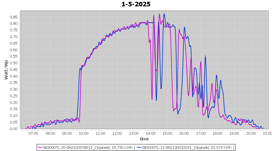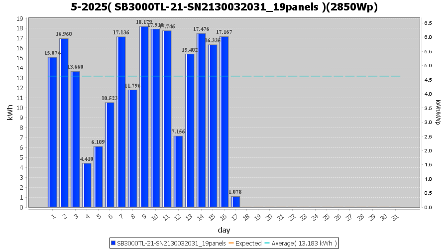 | 14-5-2025 | kWh | Sum | W/Wp | 35.280 | 6000 | 5.9 | 16.317 | € 13.23 | 7.7 |