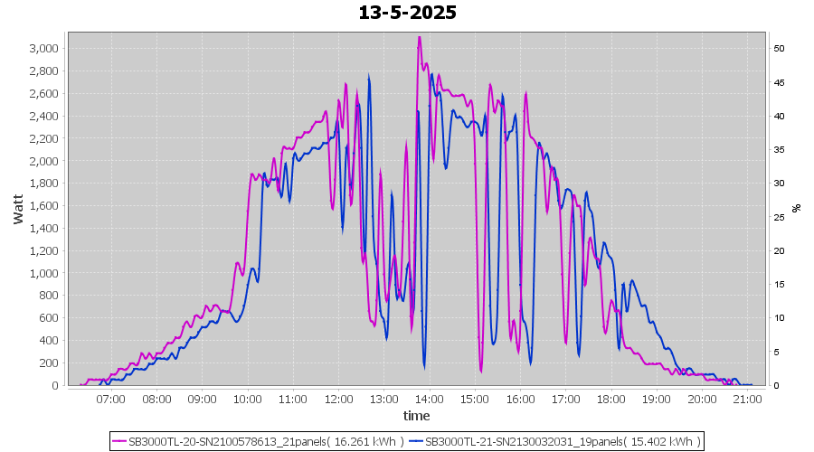 | 13-5-2025 | kWh | Sum | W/Wp | 31.663 | 6000 | 5.3 | 14.644 | € 11.87 | 6.9 |