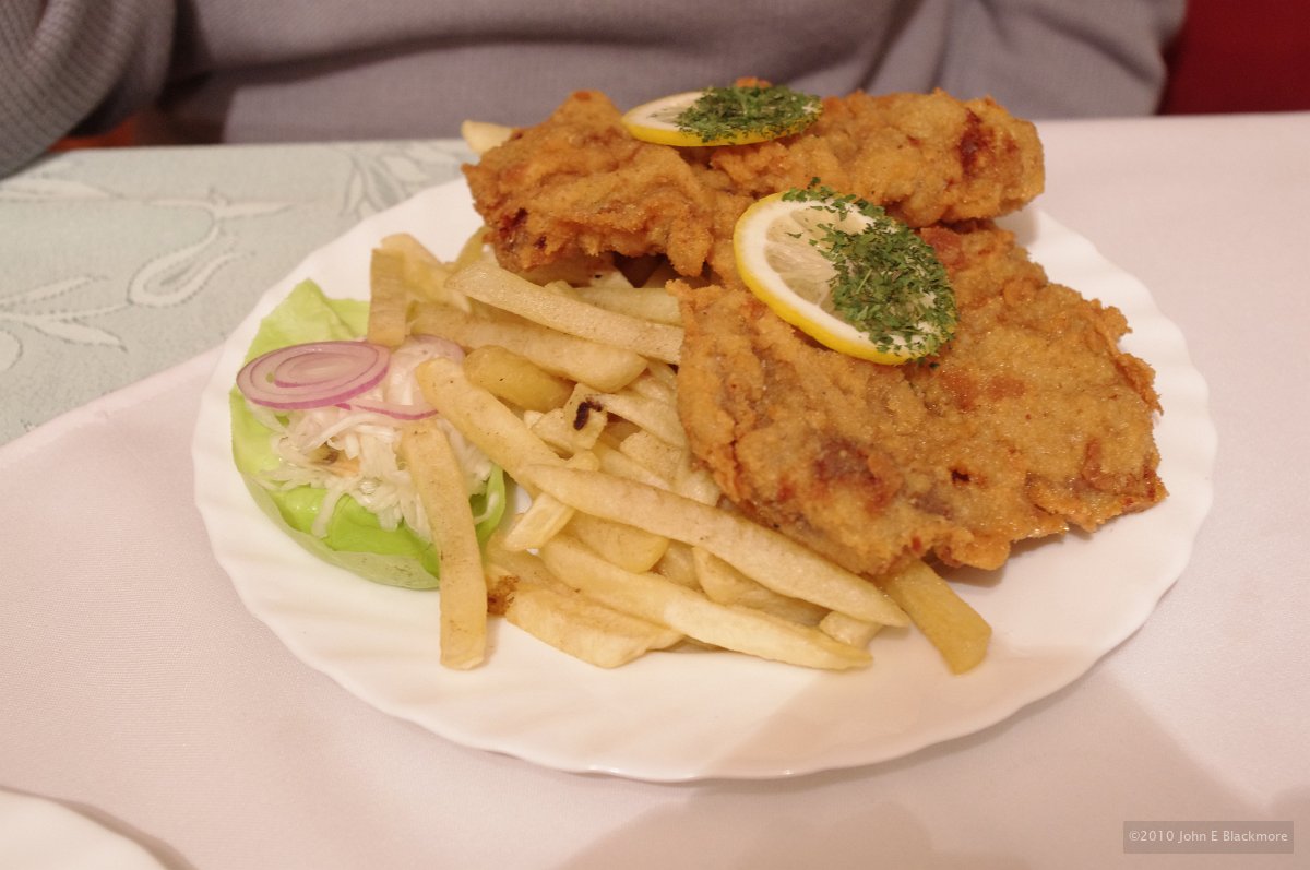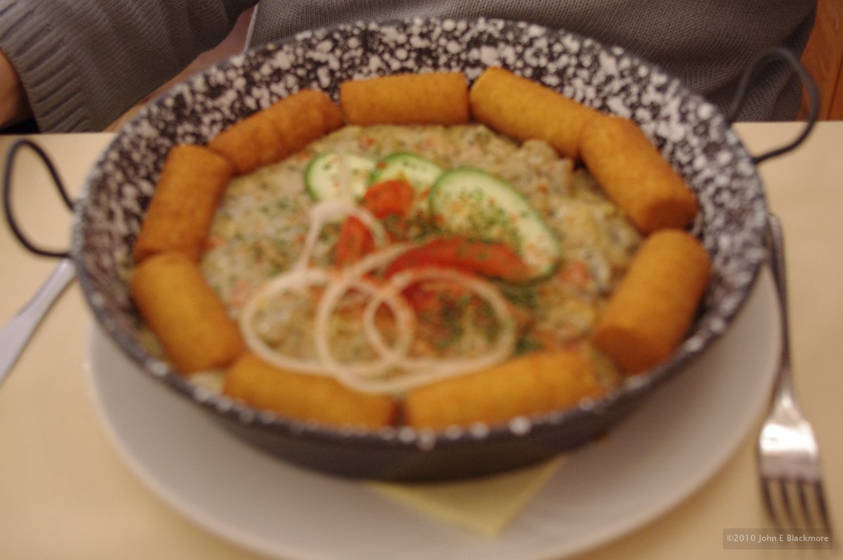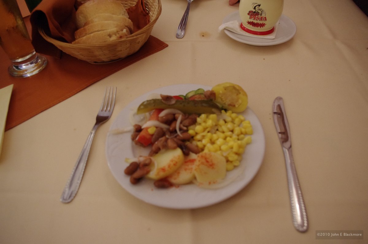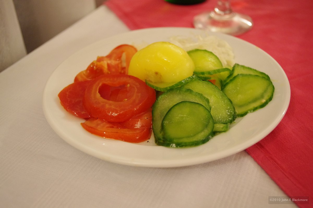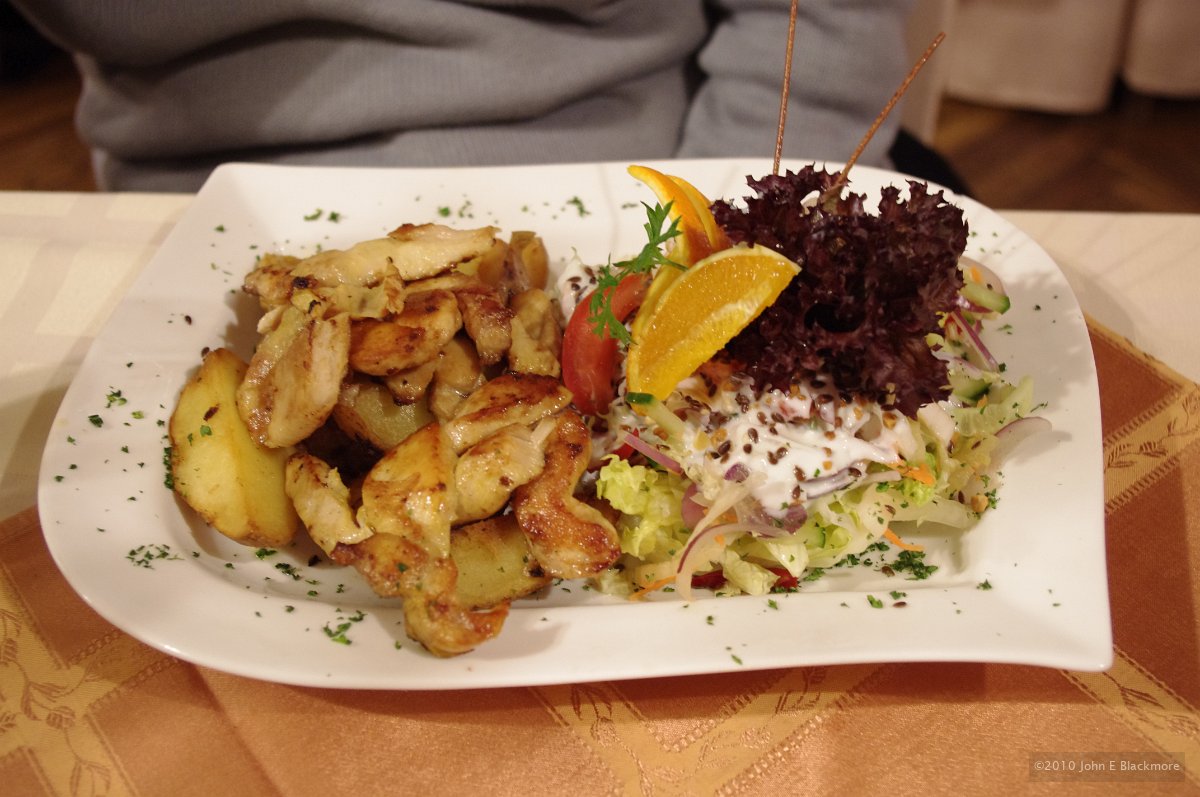 14 Kaposvar - ginger and curry chicken pieces with garden salad in yoghurt dressing, potatoes fried in skins |