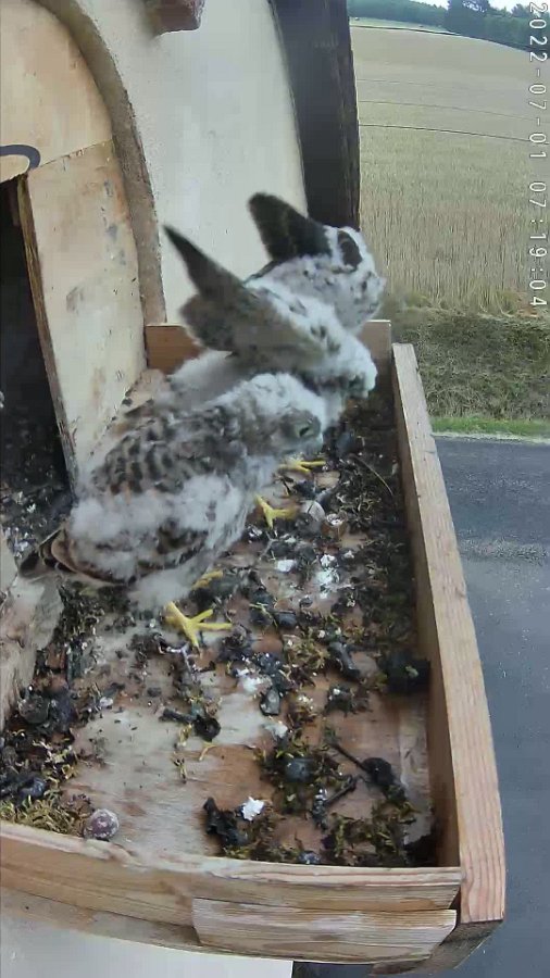 video - 12h18 the female brings a vole which one chick takes; the female goes into the nest to try to share it